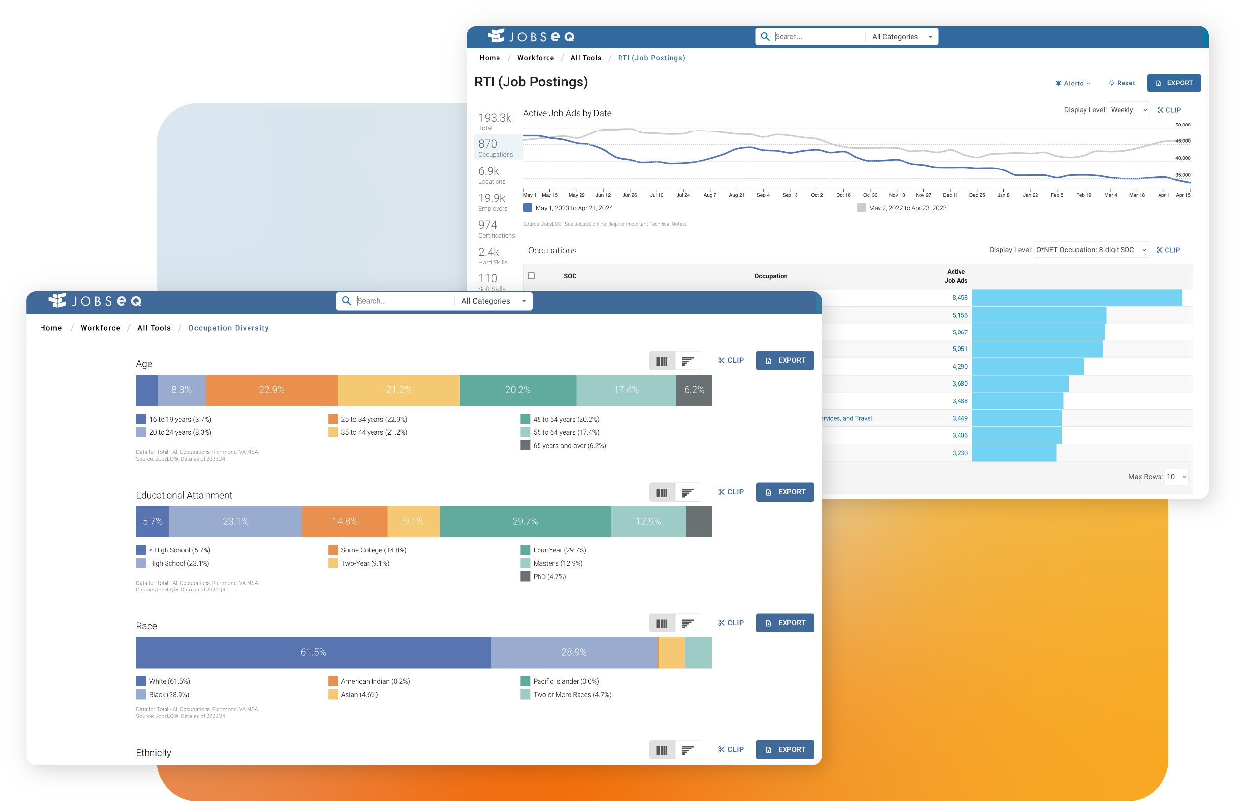I've found JobsEQ to be so helpful in my organization's efforts to recruit new companies I've added access to all MSAs and counties in the USA, plus subscribed to Real Time Information and Resume Forensics. Review collected by and hosted on G2.com.