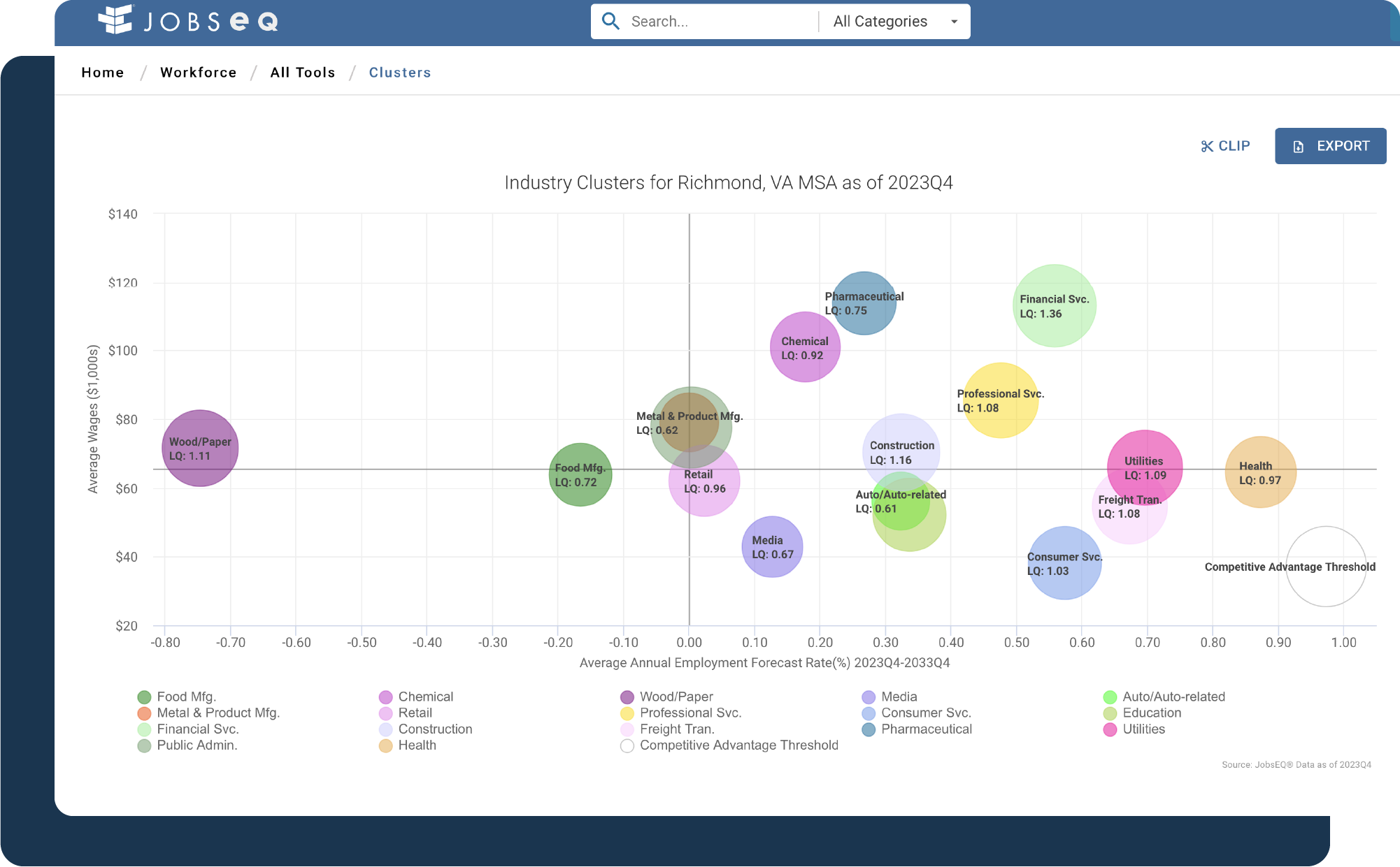 The feature I most like about JobsEQ is the flexability in creating custom things - custom regions, custom industry groups and custom occupations. You can easily create the region, industry or labor force that you need and then compare it to any geography that you have access to.