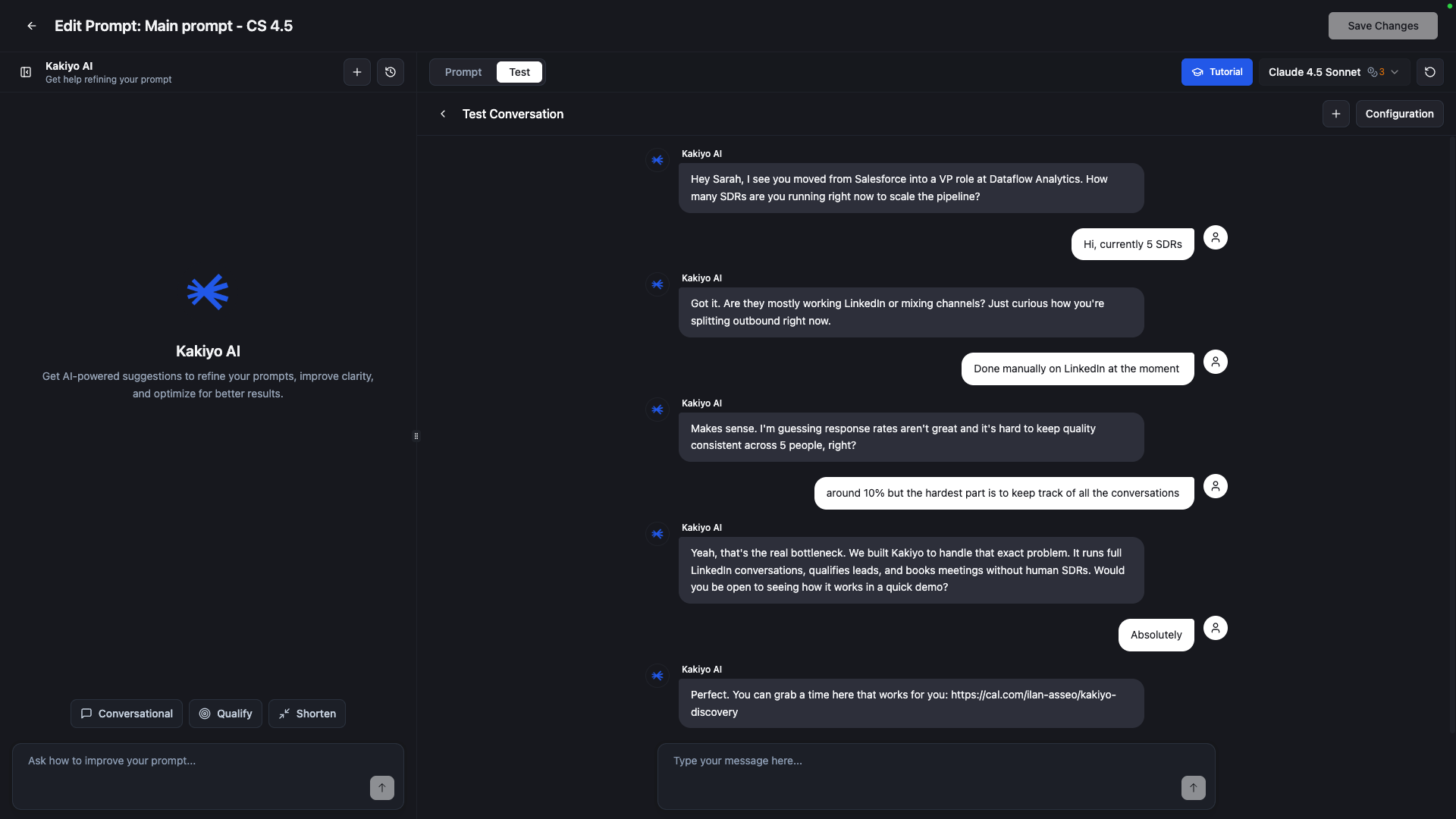Kakiyo solves this. The AI conducts complete conversations on autopilot, answering questions, handling objections, and qualifying prospects through uniquely generated messages based on conversation context and enriched prospect data. Every interaction is personalized and adapts in real-time to each prospect's specific responses. You get both scalability and personalization.
