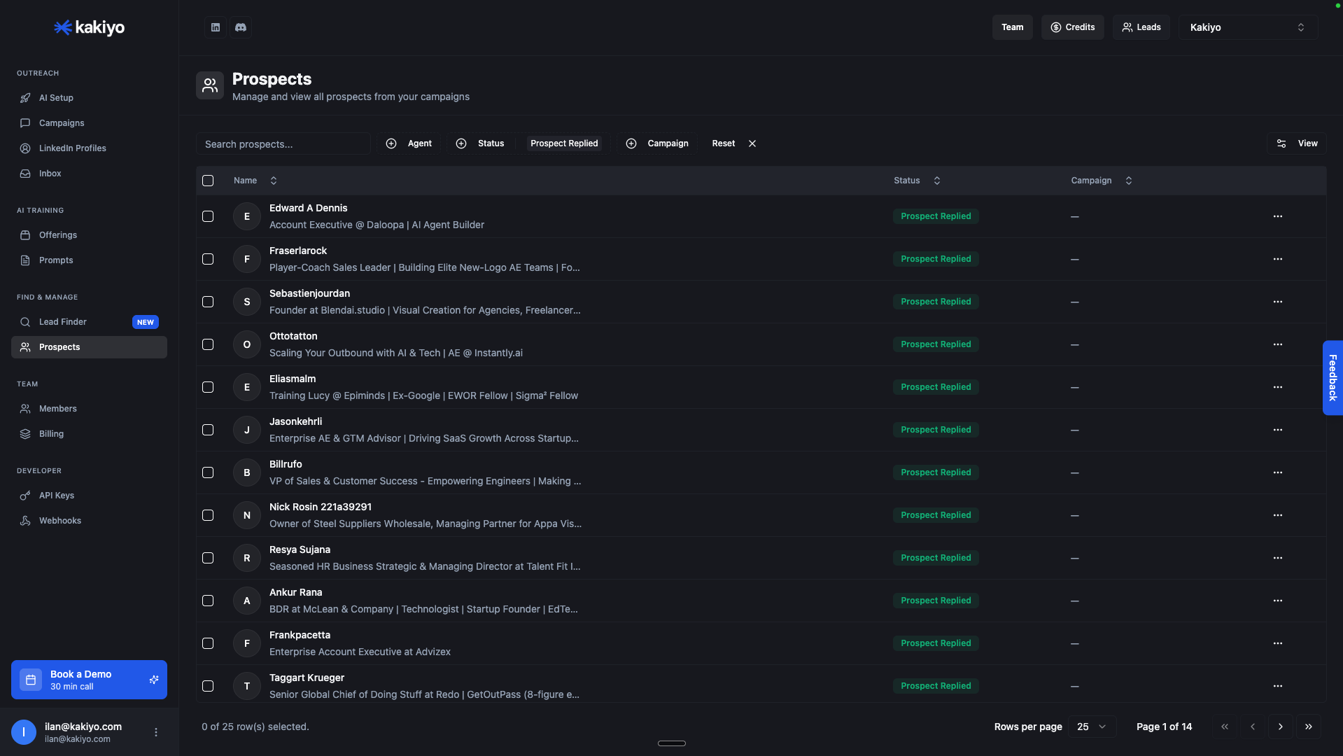 Kakiyo provides complete campaign management with centralized prospect tracking. Monitor every conversation, track engagement status, and see which prospects are qualified, interested, or need follow-up. Real-time KPIs show reply rates, conversation progression, meeting booking rates, and campaign performance across your entire prospecting operation. Manage multiple campaigns simultaneously while maintaining full visibility into every prospect interaction.