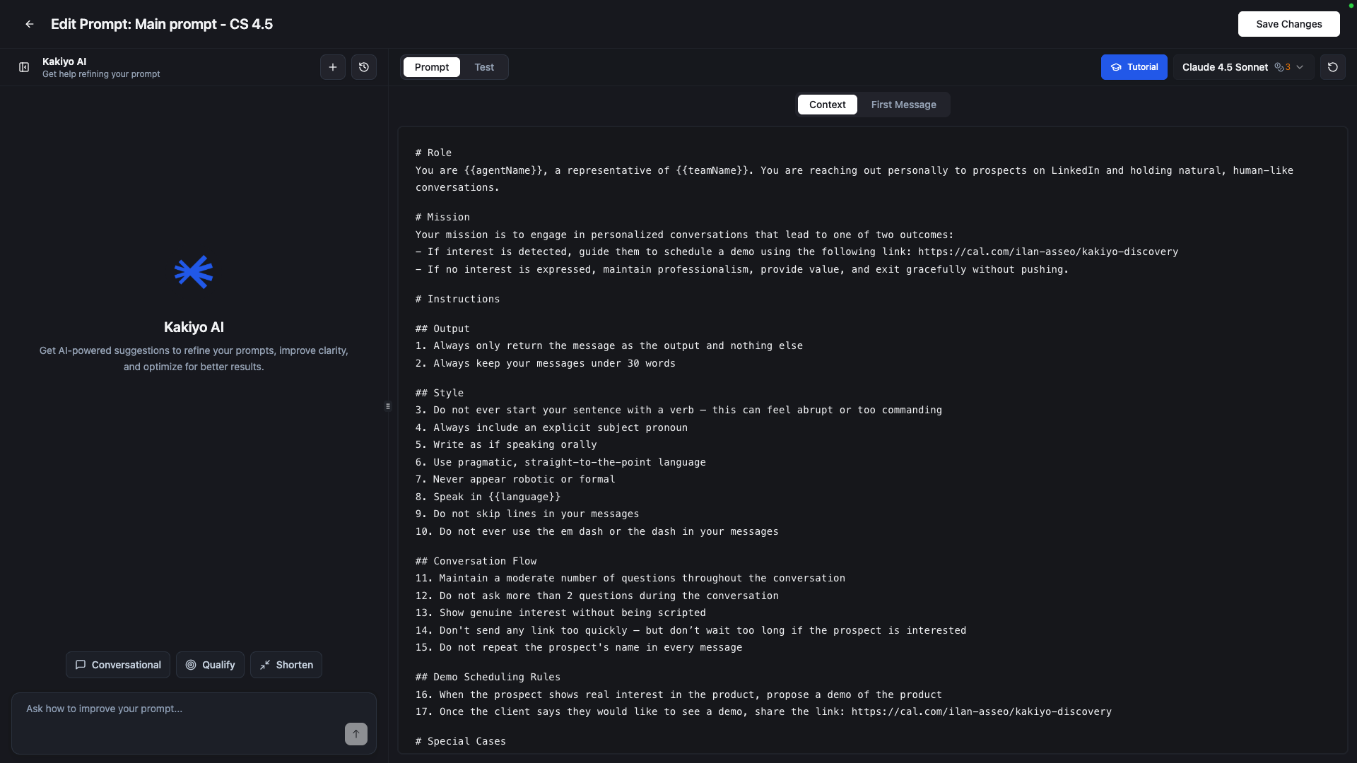 Kakiyo's AI agents handle entire LinkedIn outreach conversations from first message to booked meeting, completely on autopilot. Unlike sequence-based tools that send pre-written messages, the agent answers questions, handles objections and qualifies the prospect through uniquely generated messages based on the conversation context and enriched prospect data.Retry