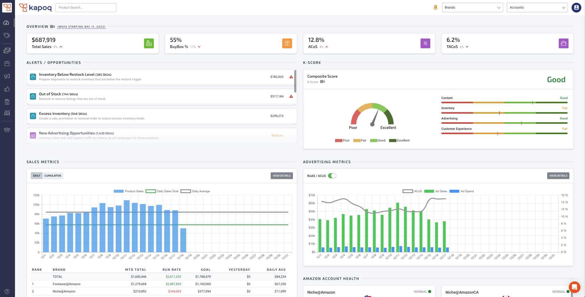 Kapoq is great for managing multiple Amazon brands on a daily basis and organizing a daily workflow to maximize actions that make the largest impact for each company. The ads tool is super powerful, and probably saves our tiny team 10 hours per week on proactive and reactive management tasks. The content tools are equally important and surface real time data helpful to prioritize fires to put out and initiatives to plan. Never seen more actionable data on inventory and overall analytics that are used in a way that real Amazon business are operated. I learn something new and useful in there every day and it levels up our team.