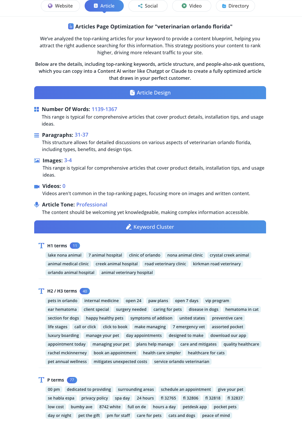 I find that keyword finder is most useful for finding those keywords that you not normally find that aren't used by the "Big Money" marketing machines. It offers plenty of the less used keywords that you can dominate that space and get your page ranked without the fight. The keyword brief is like nothing I have seen. The breakdown of the website, article, video, social, and directory sections are optimizations for each, gives examples and explains the importance of the content in each section. MYself, I use every time I am making a lead magnet, ad page, writing headlines, or content...etc because I want the best SEO product when posting. Implementation is simple once you get the hang of it, so there is short learning curve to understanding what it all can do. I am only using the Open Ai integration at this this time, but it was simple to set up, and allows for a deeper keyword search. As for support, they are second to none. I am always working with support because of my personal issues and incorrect usage of the product, but they are always there within 24 hours for me, but never more than 48. I love the support because you don't have to wait. Review collected by and hosted on G2.com.