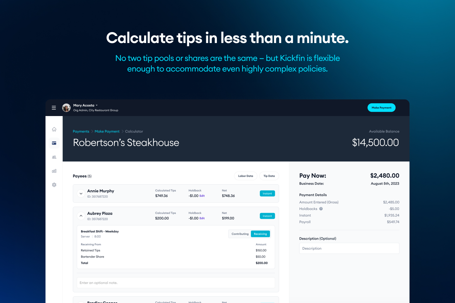 I find Kickfin incredibly intuitive and easy to use, which makes setting it up a breeze. Its online capabilities eliminate cash handling issues, allowing seamless tip distribution even when I'm not in the restaurant. This system ensures that servers always receive their tips fast and reliably, enhancing efficiency and peace of mind. Kickfin's simplicity and effectiveness ensure that it just gets things done, making it a dependable solution for my needs. Review collected by and hosted on G2.com.