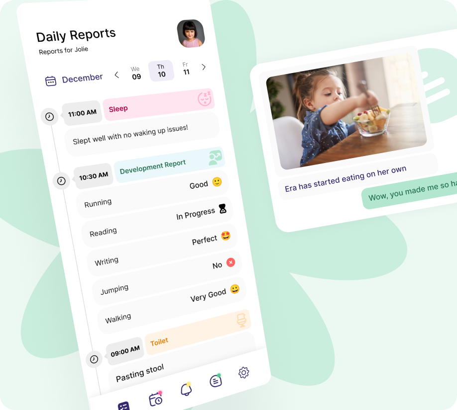 DAILY SHEETS: Send daily activities for infants/toddlers and record Diapers, Bottles, Naps, Meals, Bathroom visits. Reports are sent to parents automatically.