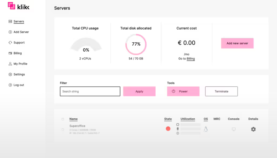 Klikk's self-serve dashboard solution sometimes leaves something to be wanted, as it does not show all the actual possible configuration options. We have sometimes wanted to turn on, or tune, some particular functionality for our Klikk-hosted virtual servers, but have not understood how to do that in the dashboard interface, and therefore contacted their support department who has then told us either that we can use a particular API-call because the user interface does not support the configuration, or that they must make the necessary changes for us. However, they have always been accommodating and helpful. Review collected by and hosted on G2.com.