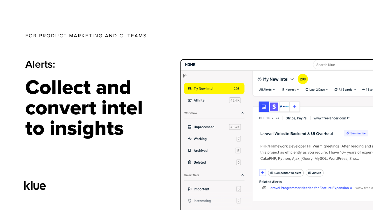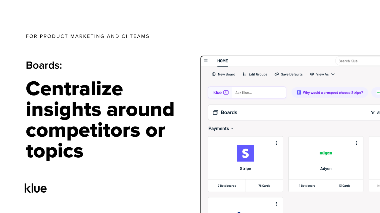 I particularly like that Klue makes it easy to centralise every piece of information about a particular competitor, with the flexibility to add different types of Boards and different formats of Battlecards to support different audiences. It's easy to see how different products from overarching companies fit together, saving time and keeping the UI easy to navigate for end users.