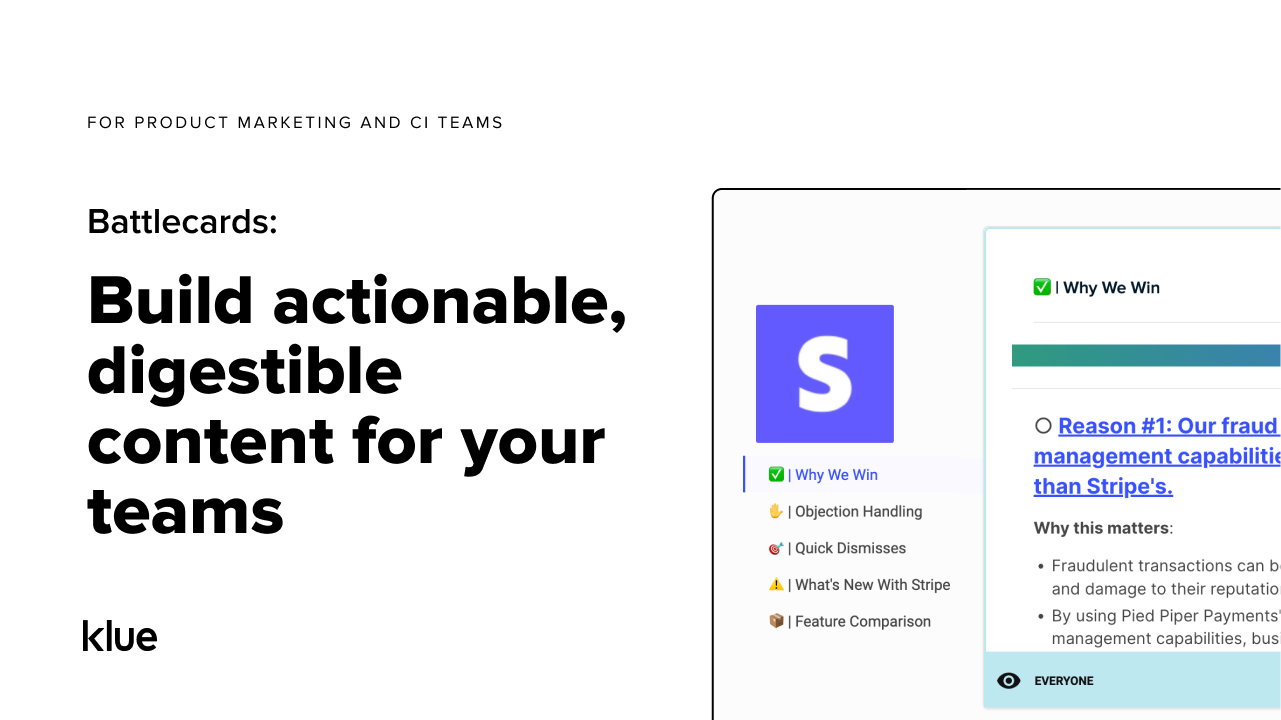 The UI can be a little frustrating to use as a Curator, particularly for editing content and applying formatting consistently. It would be great to be able to set up card templates, and to add more colours and formats to text. I'd also like to have a more open-ended style format for a battlecard to make it easier to transition content into Klue without needing to lift everything into a specific battlecard format.