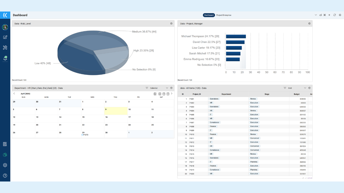 Kohezion includes drag-and-drop application building, real-time dashboards, automated workflows, REST API access, embeddable online forms, scheduled reporting, and granular permission controls. The platform scales with the organization — applications can be modified in real time as processes evolve, without outside help. For organizations that need to move quickly, Kohezion's turnkey implementation service handles setup, data migration, and initial configuration.