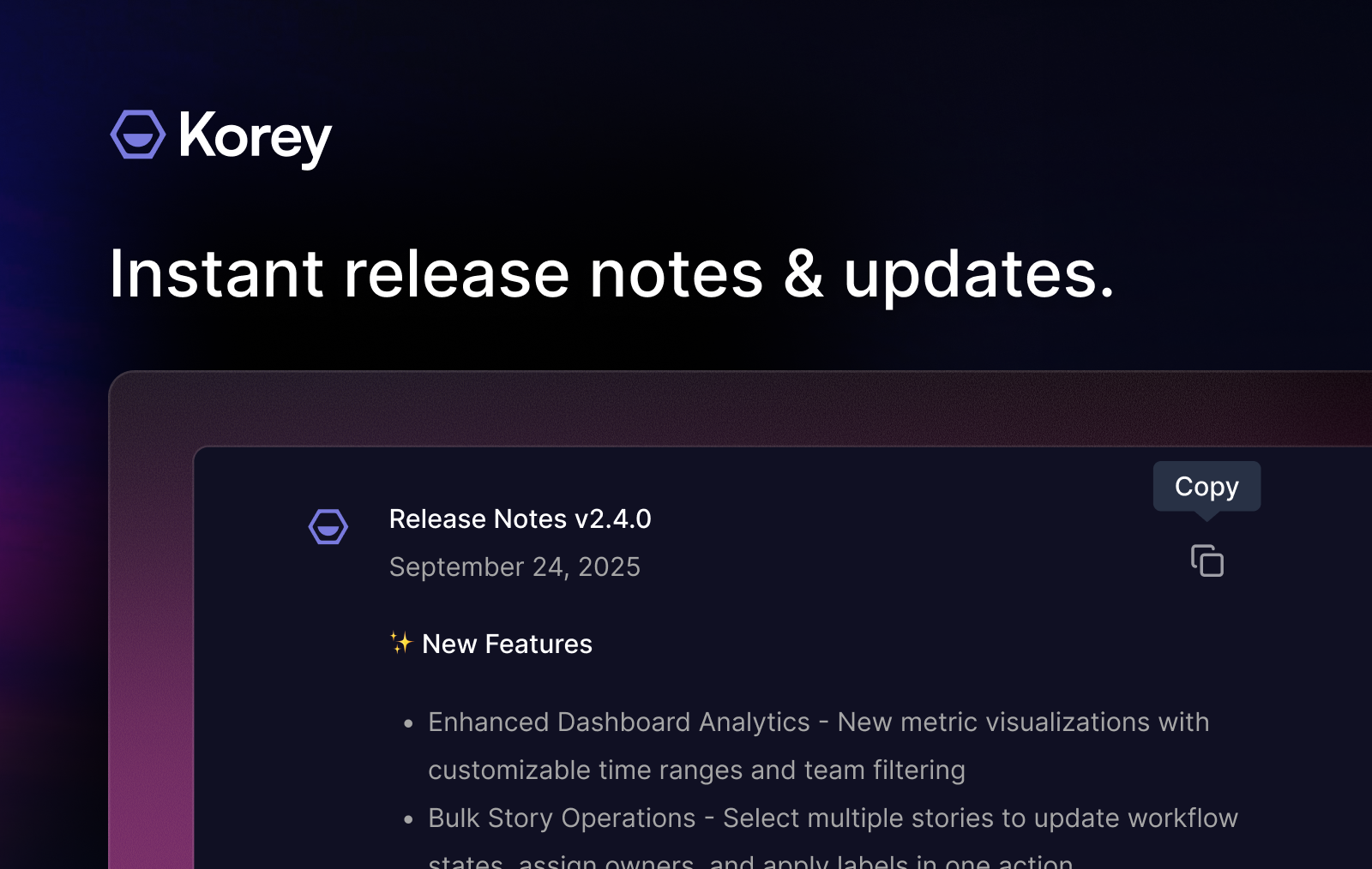 - Instant Project Summaries: Curious how things are going? Just ask Korey for an update, and you'll get a clear, readable summary based on real-time data from Stories, comments, and commits. Korey makes it easy to get ready for stand-up or create release notes.