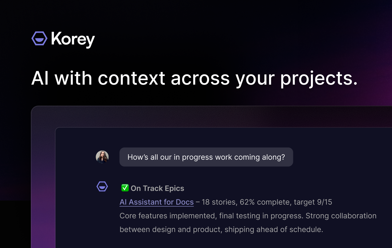 - Answers on Demand: Want to know what shipped this week, what's pending, or how a specific Epic changed? Korey is always ready with answers, powered by your actual project data.
