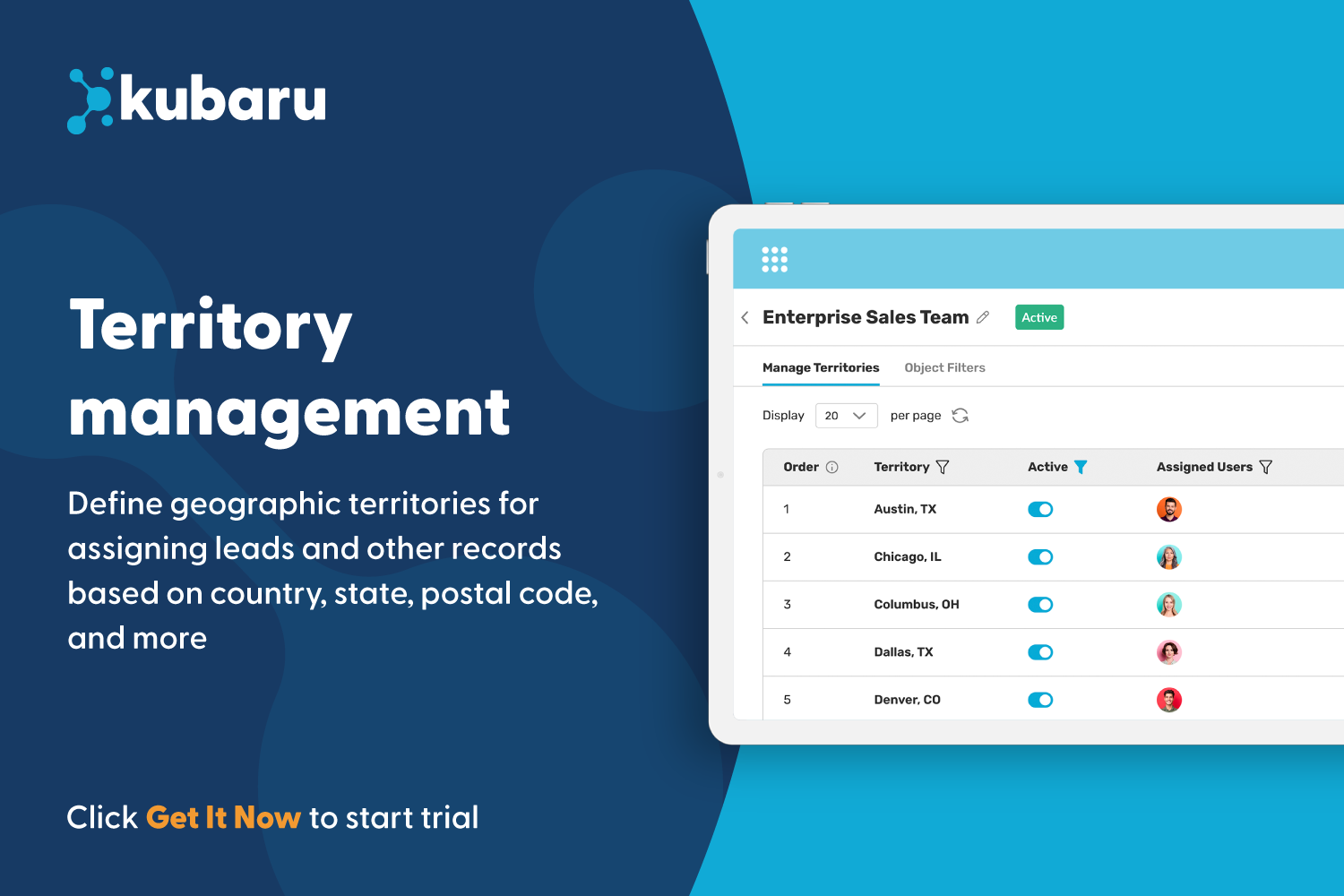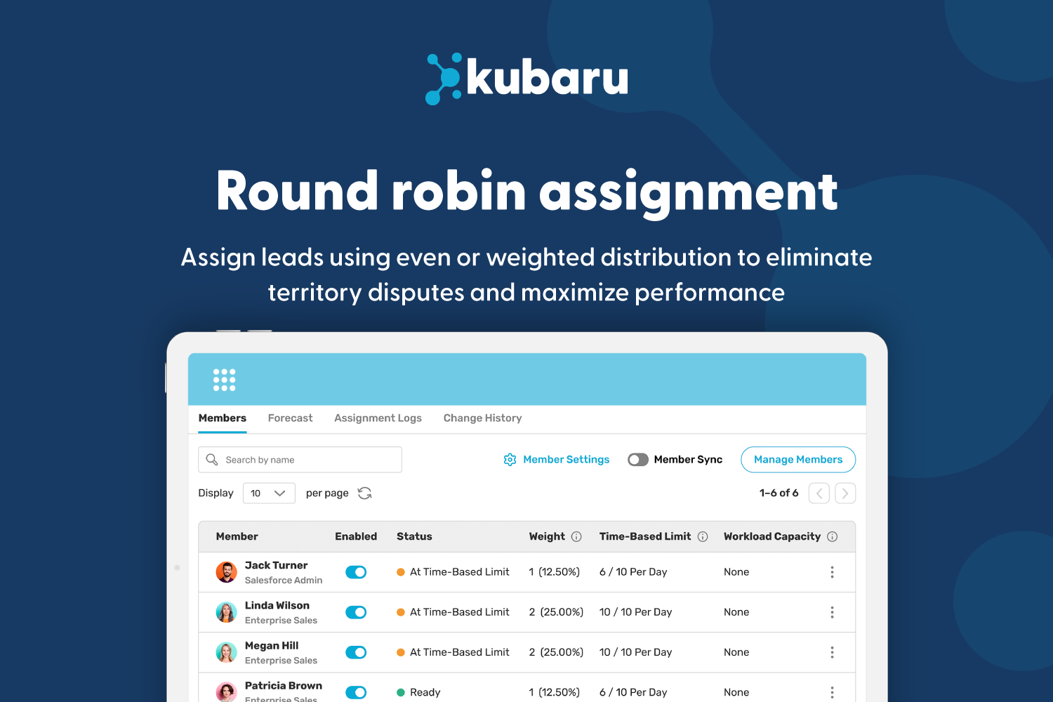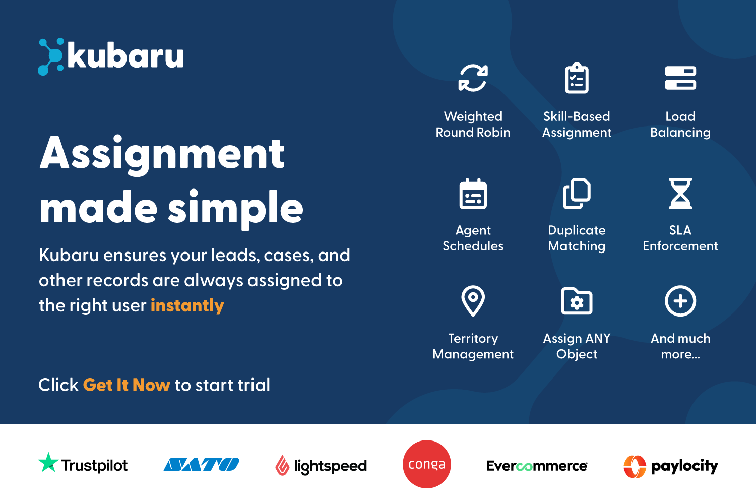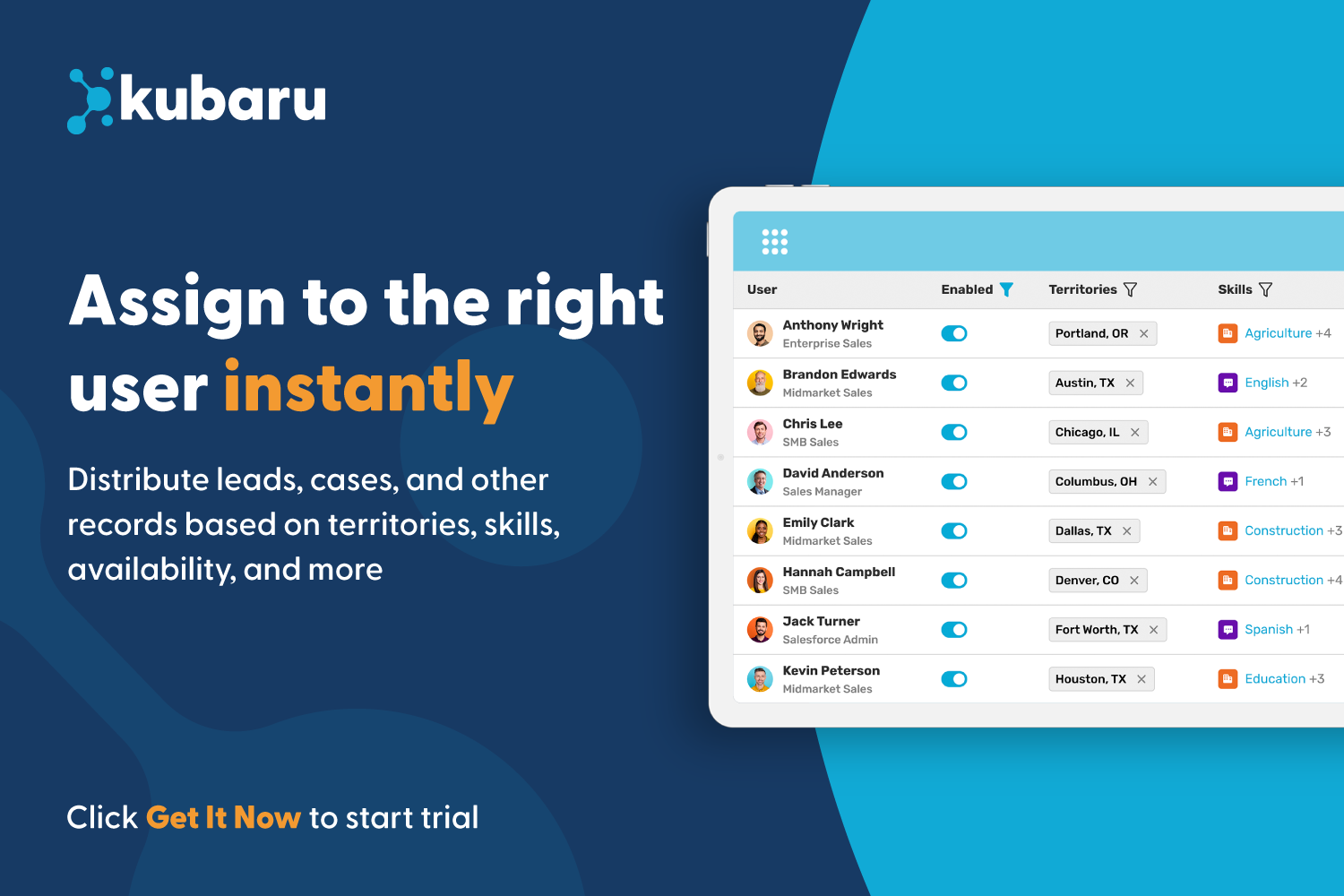 Kubaru assigns leads, cases and other records to the right person at the right time using powerful features including round robin assignment, skill-based routing, load balancing, shark tanks, reassignment, schedules, and more.