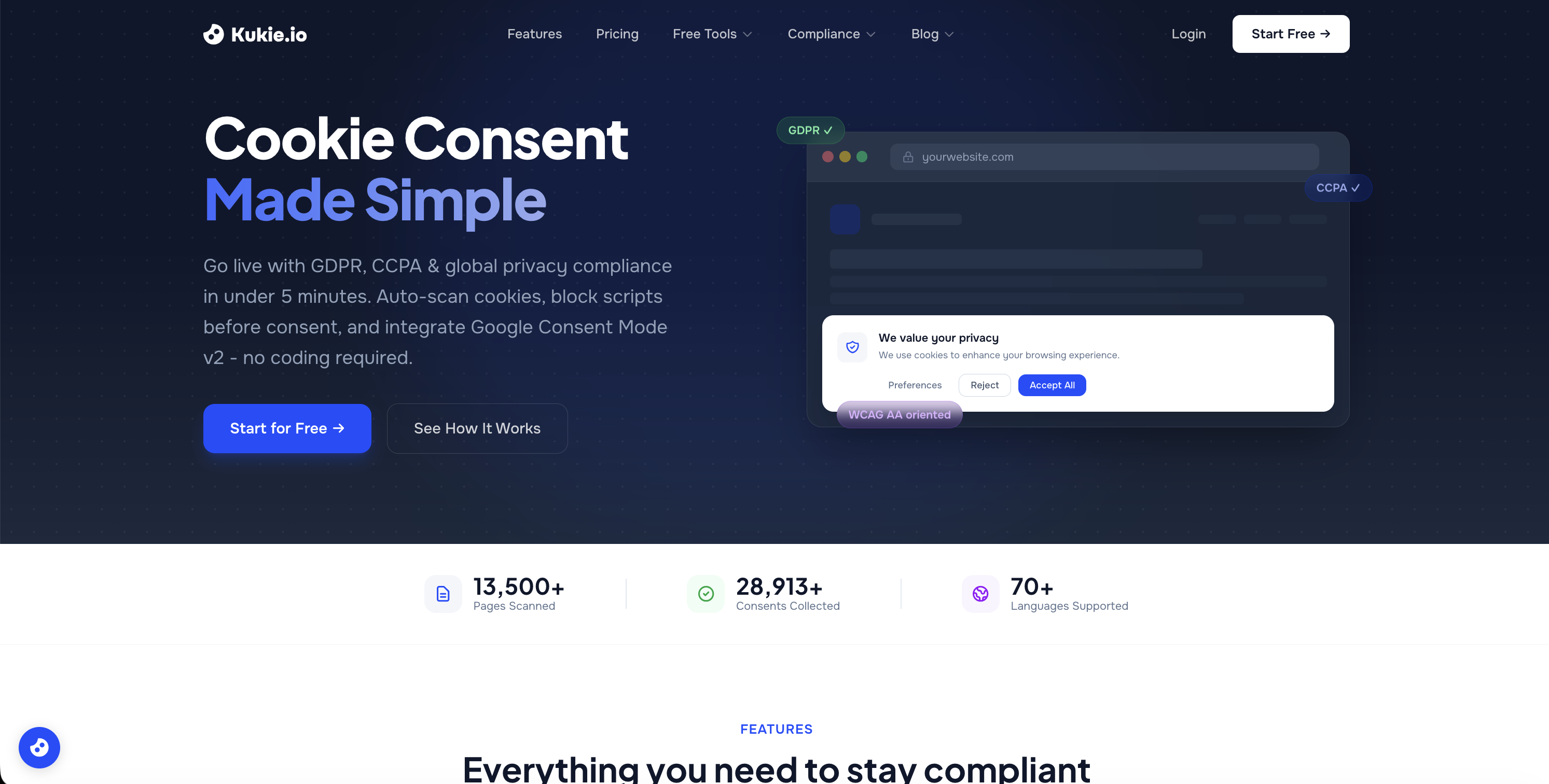 Kukie offers a generous free plan for small websites, with paid plans that scale based on the number of sites and monthly pageviews. The platform includes a WordPress plugin for one-click integration, and a simple script tag for any other website or CMS.