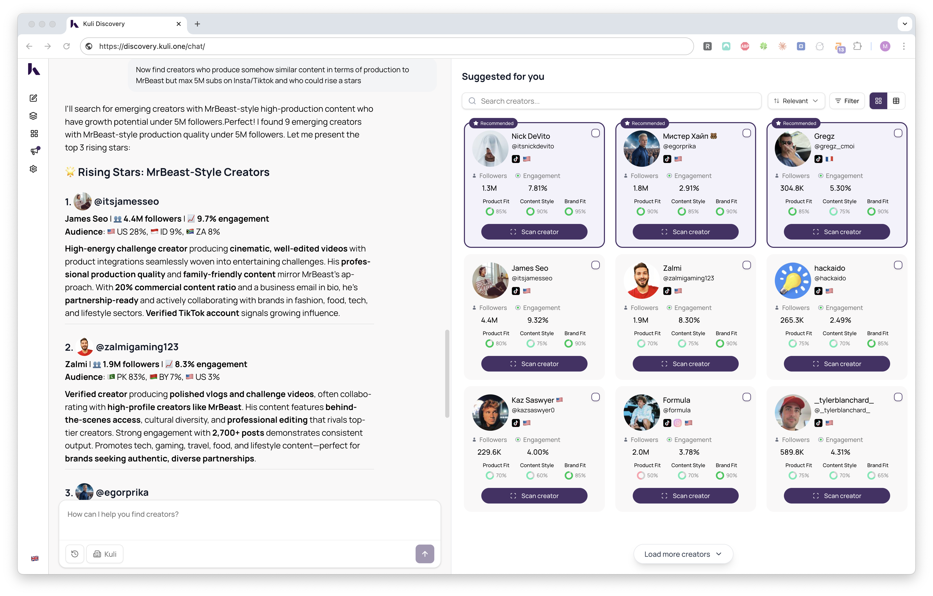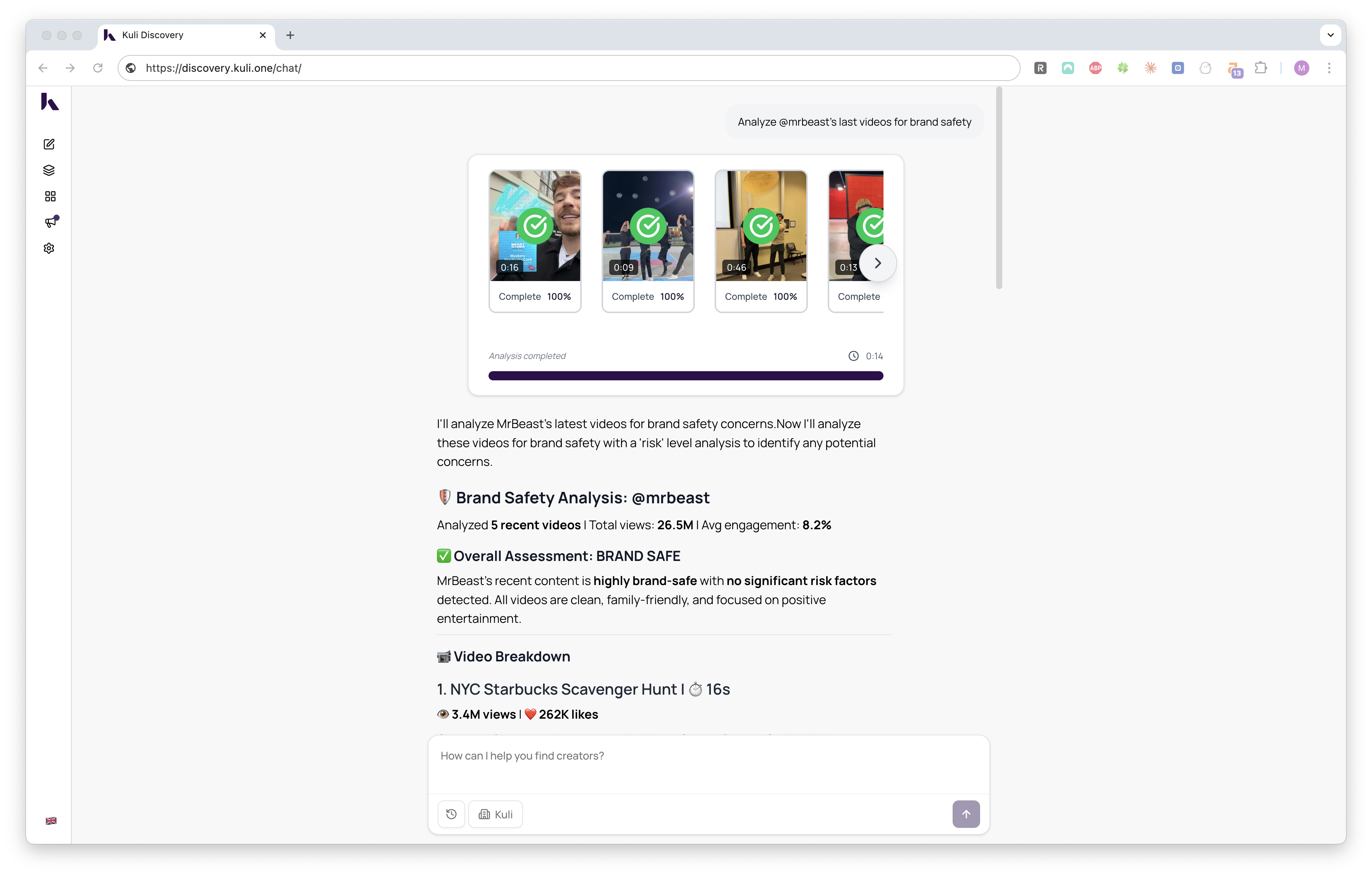 Kuli's AI agent watches the content and analyzes what creators actually produce, not just who follows them. It evaluates thousands of videos in parallel, surfacing insights that would take human teams weeks to compile manually.