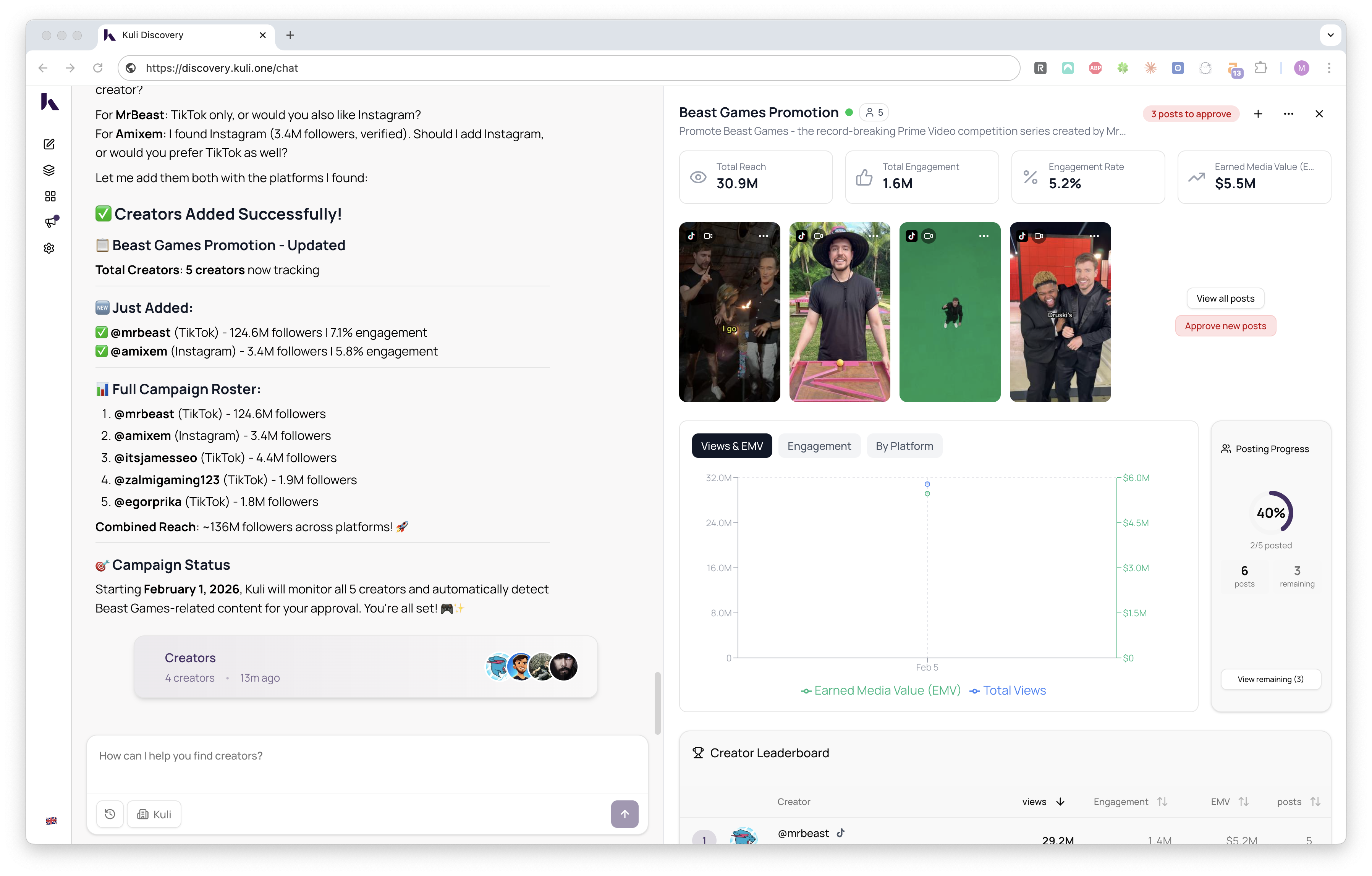 - End-to-end campaign management: Work with Kuli to automate personalized outreach, negotiations, approvals, deliverables, and reporting all through the chat. Ask deep dive questions on your campaign performance and run analyses on campaign posts to identify insights.