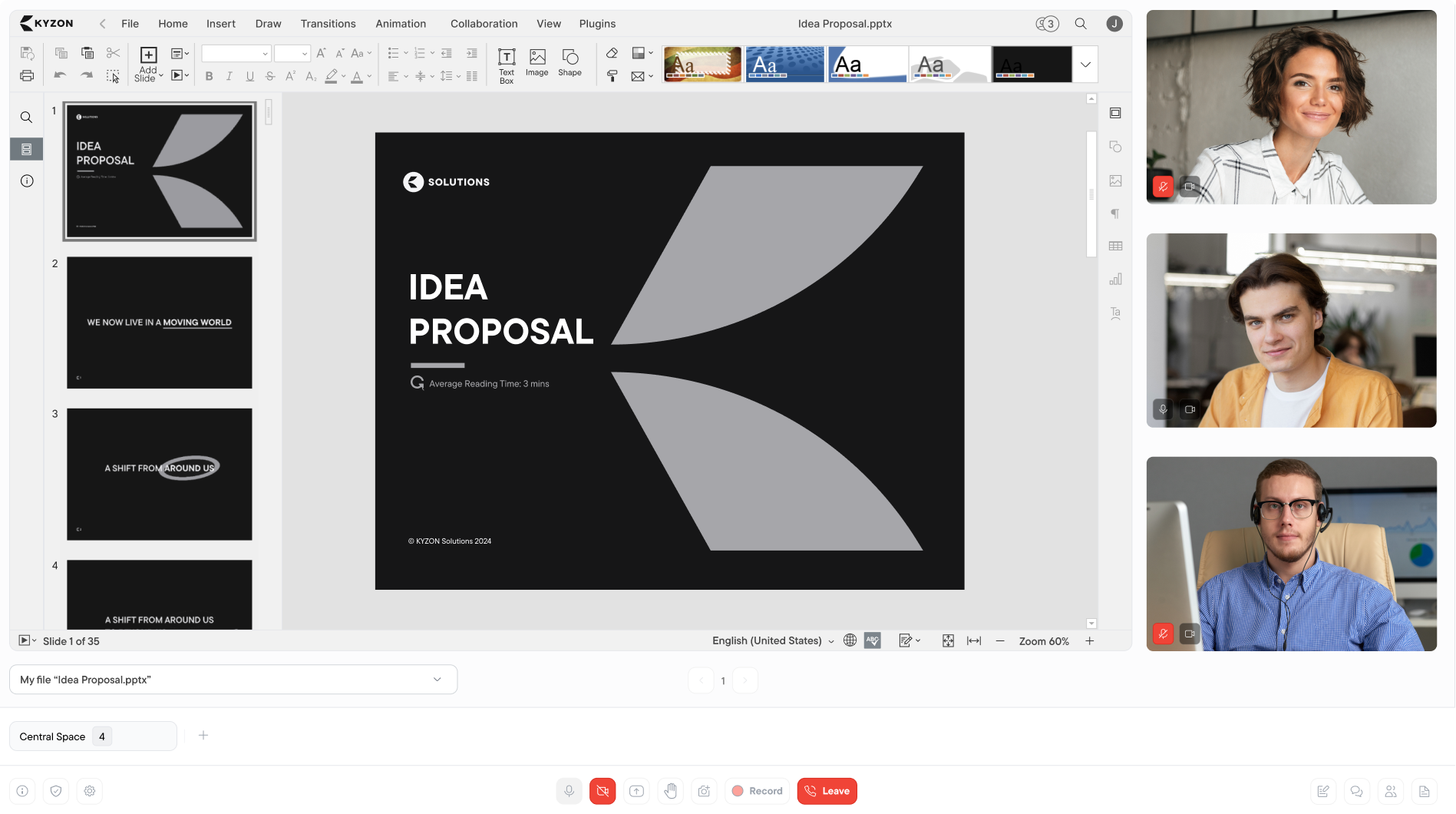 I was looking for a tool that could replace Session Us as these guys have gone bankrupt. Kyzon is quite good. What I like the most is that you can work on Office documents with your team during the meeting so there is no need to send XXXX emails with new versions and copies. Everything can be done within a meeting. Another cool feature is recording so you can save all your meetings in 1 app. Review collected by and hosted on G2.com.