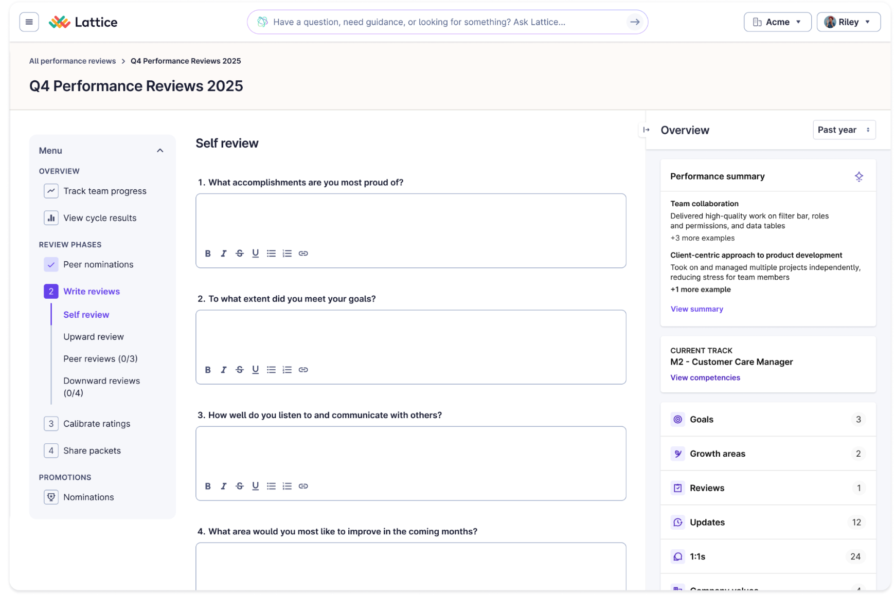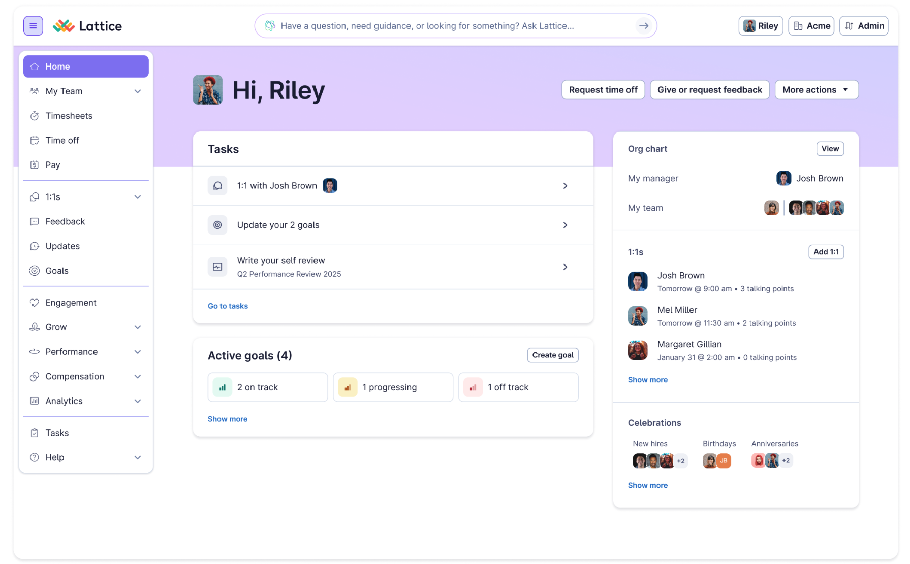 Lattice is an excellent performance management tool where I am able to run performance reviews, engagement surveys and document 1:1 meetings with my team. It is great to have a centralized location to store employee data and track our company's growth, both at the individual and institutional level. Review collected by and hosted on G2.com.