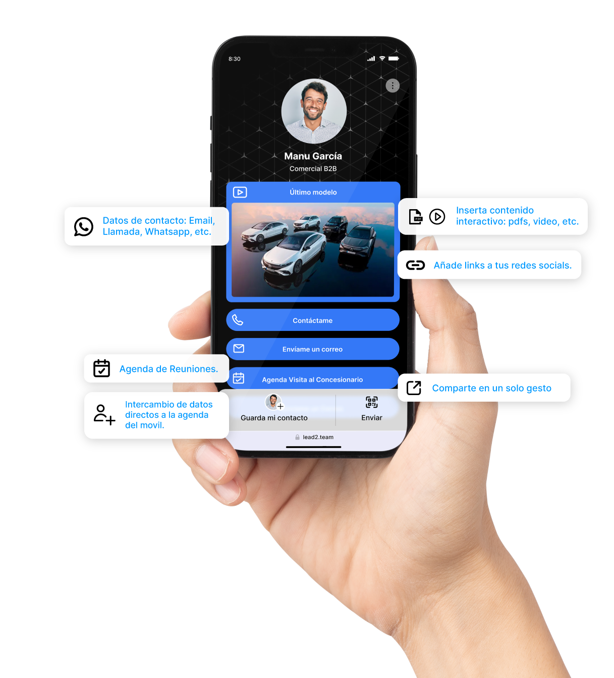 Elimina el papel y lleva tu tarjeta de visita siempre en el móvil: actualizada, interactiva y con todos tus datos de contacto y recursos de marketing de la empresa — vídeos, PDFs, agenda de reuniones, WhatsApp, WeChat y más.
