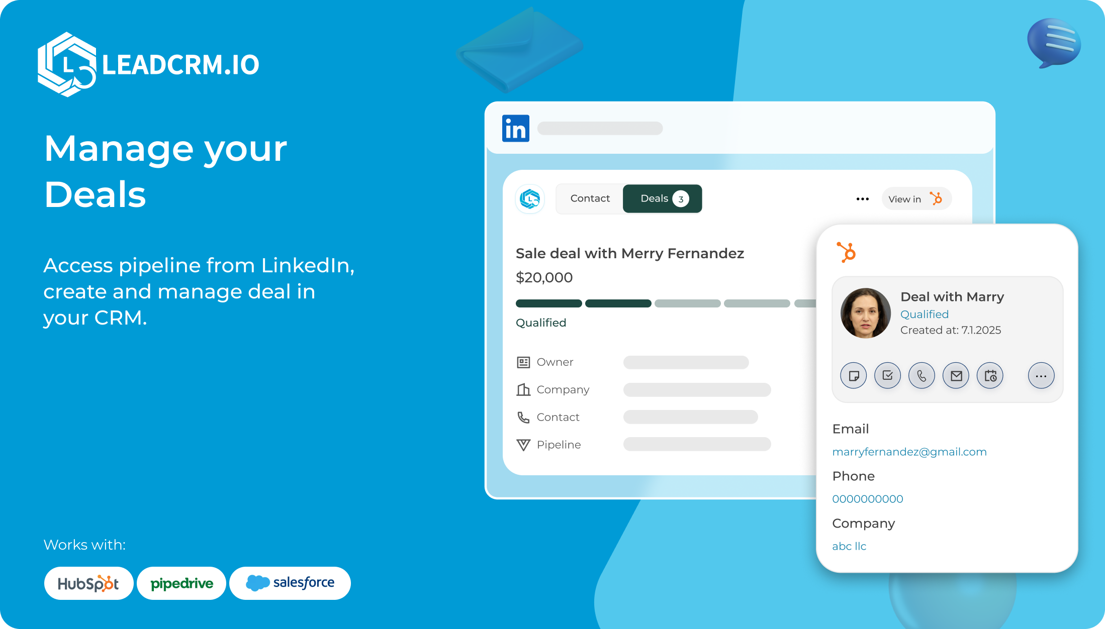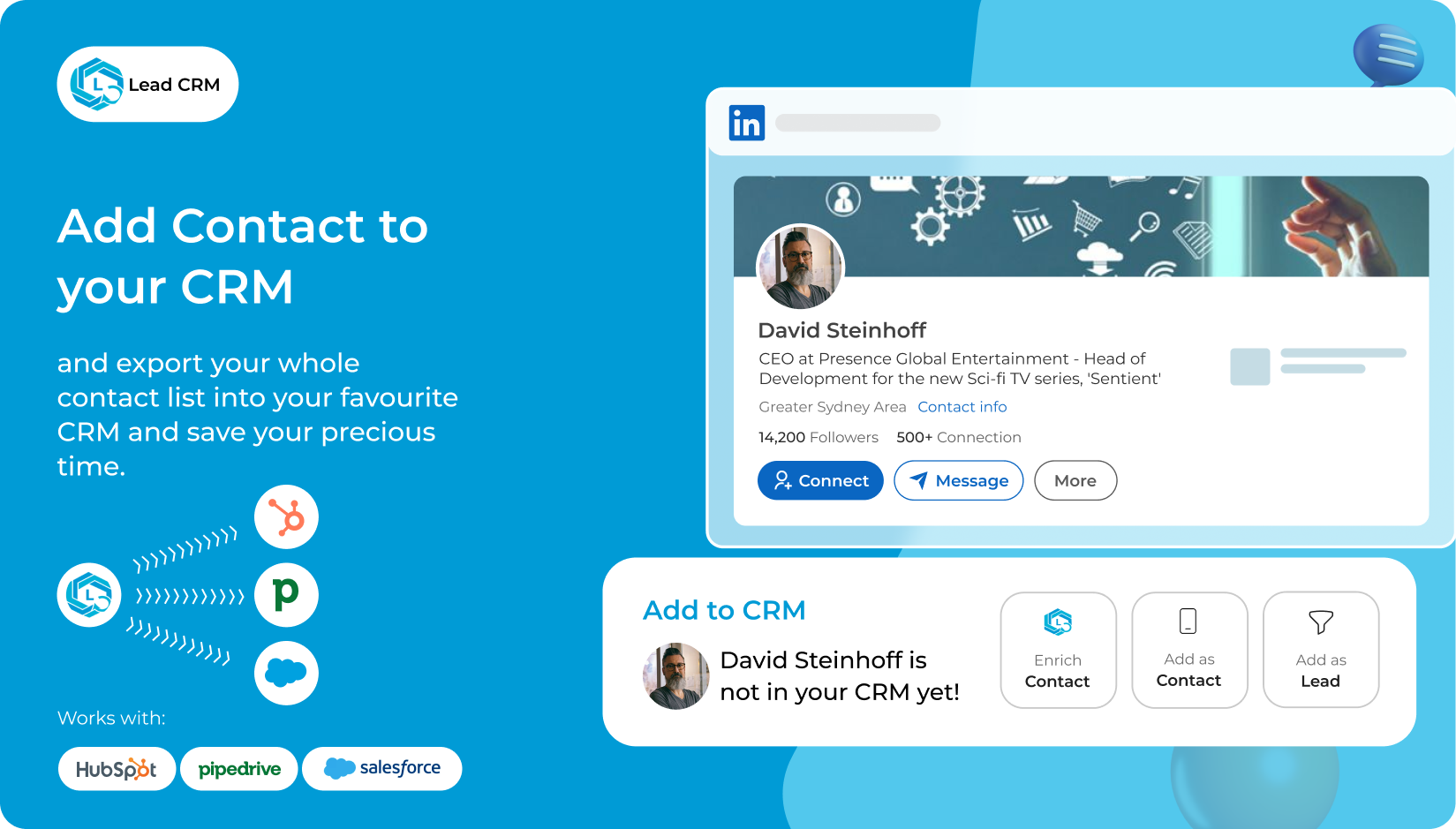 The strongest aspect of LeadCRM is its seamless sync between LinkedIn and CRM systems like HubSpot, Pipedrive, and Zoho. The Chrome extension lets our team capture prospects directly from LinkedIn profiles and push them into the CRM with a single click.