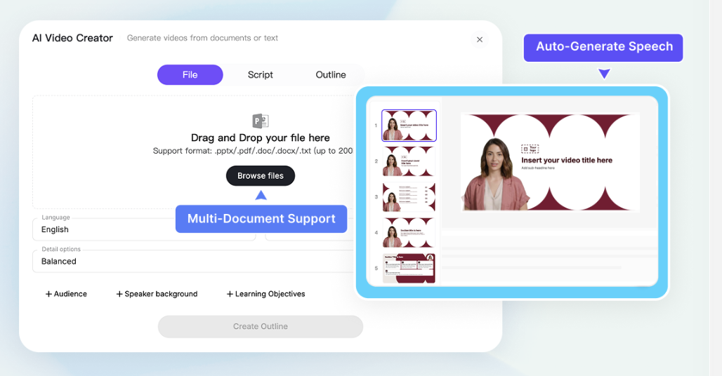 Lifelike Text to Speech & Text to Video converter that helps you create audio and video content using AI voices in less than a minute.