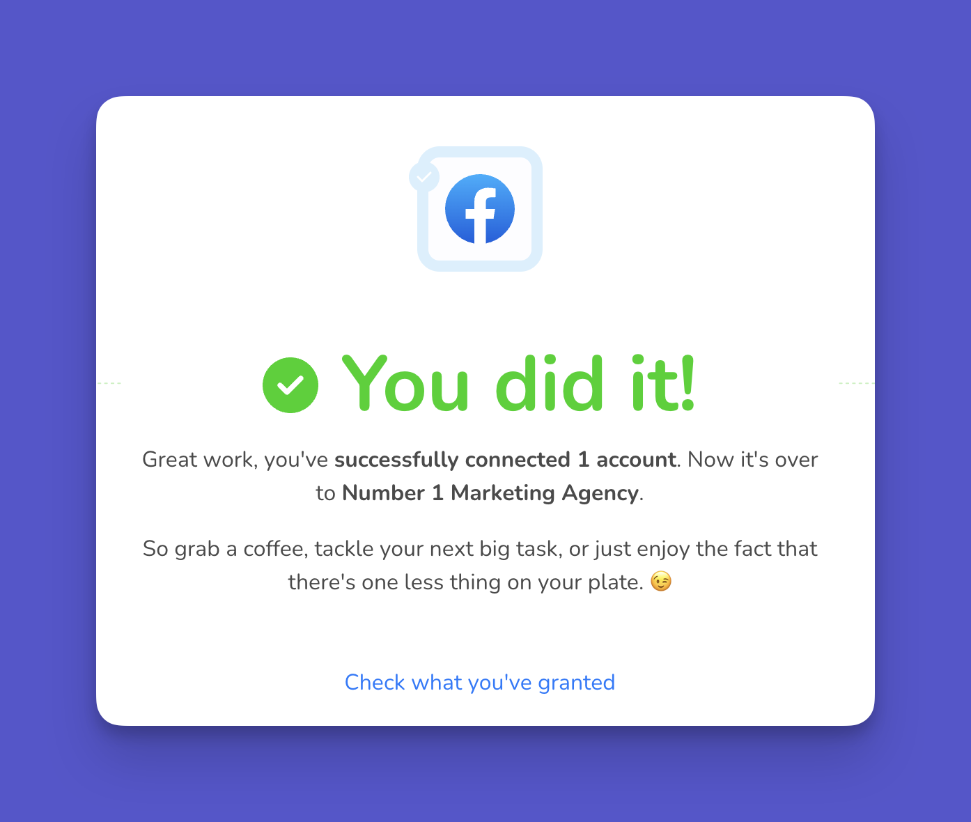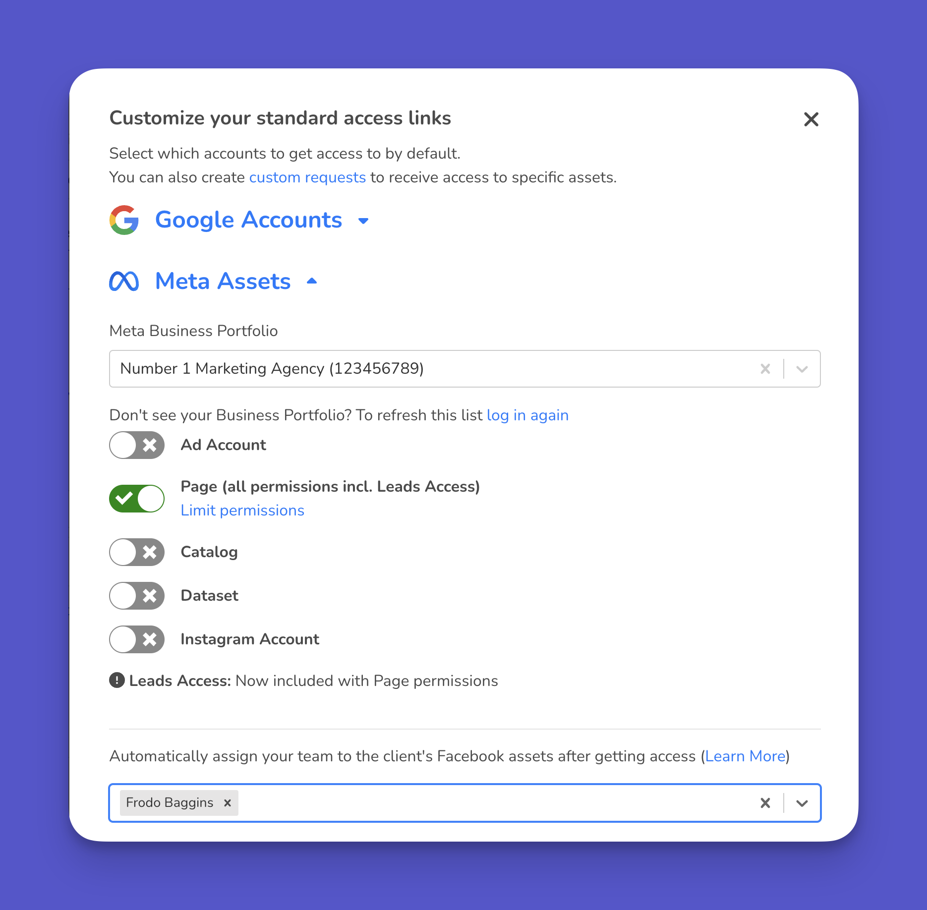 We don’t have to worry about changes in Meta or others when they change their user interfaces, authorization APIs, or access policies. We simply generate a link with the permissions we need to get in Leadsie, send the link, and their webhook alerts our systems as soon as our users grant us access to their pages and assets.
