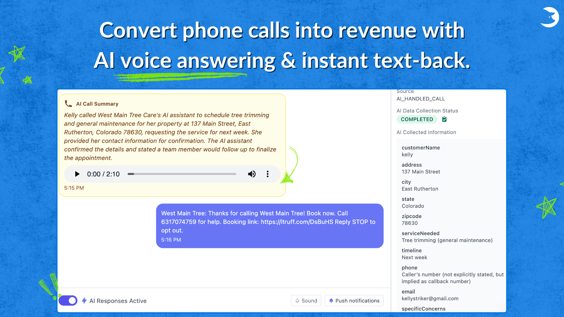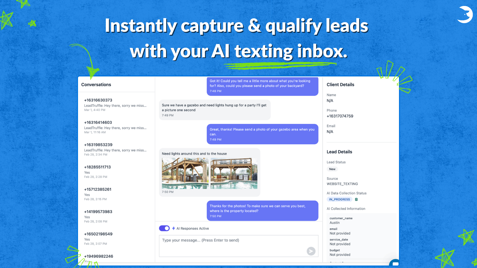 LeadTruffle is an AI-first lead capture platform designed for home service businesses. We handle leads from website form submissions, missed calls, AI voice calls, and third-party lead sources (Yelp, Thumbtack, Angi, Google LSA), using AI to qualify leads via text messaging, email, and voice conversations.