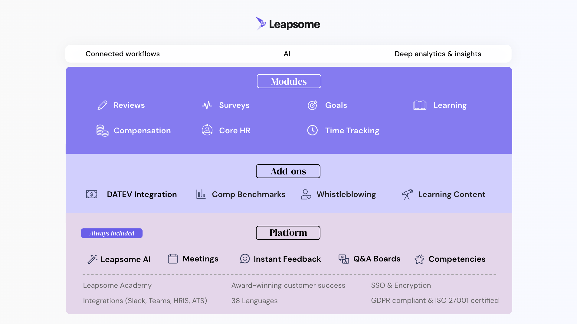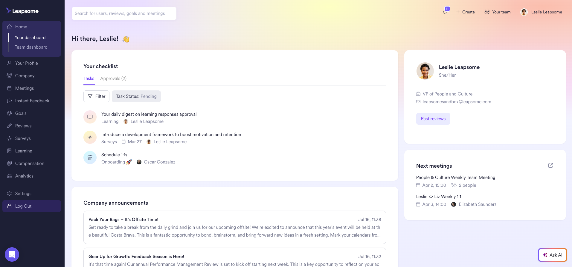 What stands out to me about Leapsome is its modern, intuitive interface, which makes the experience both enjoyable and engaging. It encourages you to set personal and professional goals, and introduces you to the latest tools, such as automation. I also appreciate being able to observe the evaluation features in action as your company develops, allowing you to reflect on each competency and receive feedback that feels unbiased and truly exceptional! Review collected by and hosted on G2.com.