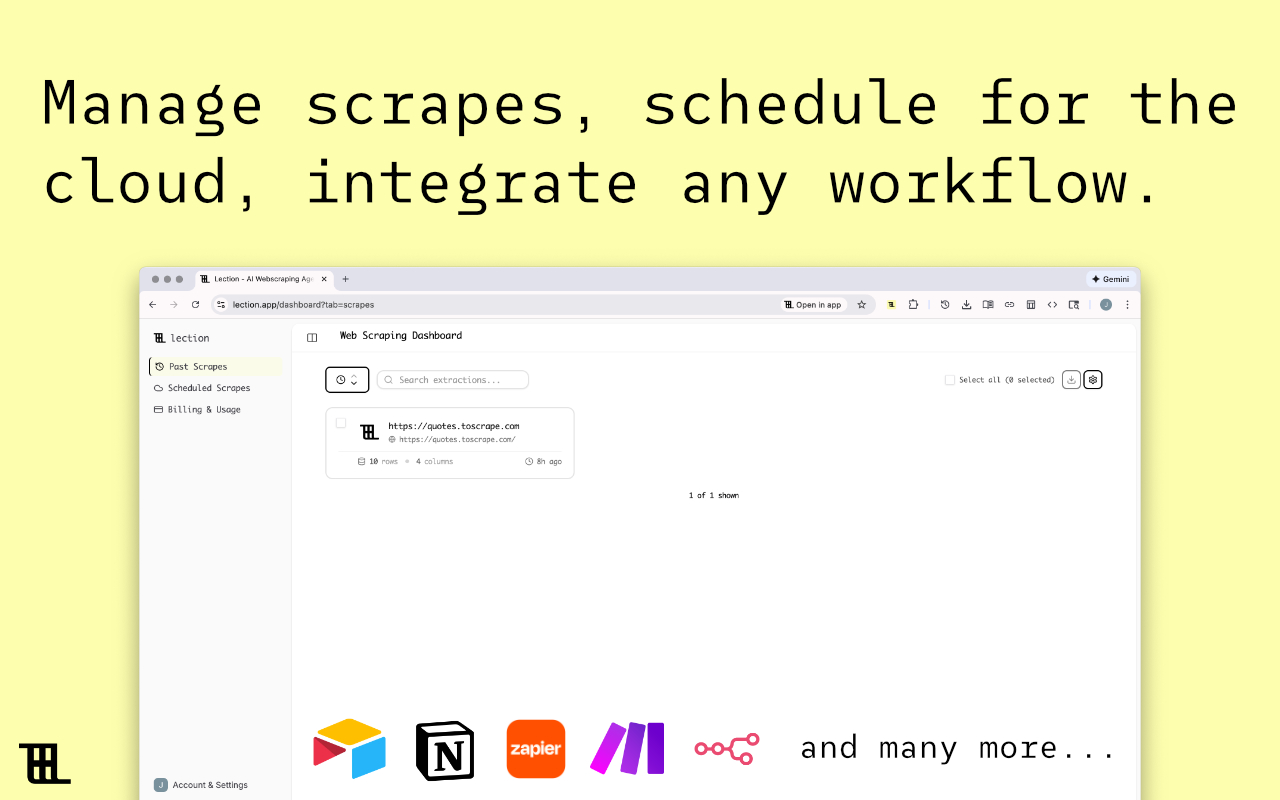 Lection is a Chrome extension that enables users to extract structured data from websites using natural language commands. The tool analyzes webpage structure and generates extraction scripts automatically, eliminating the need for manual coding or CSS selector configuration.