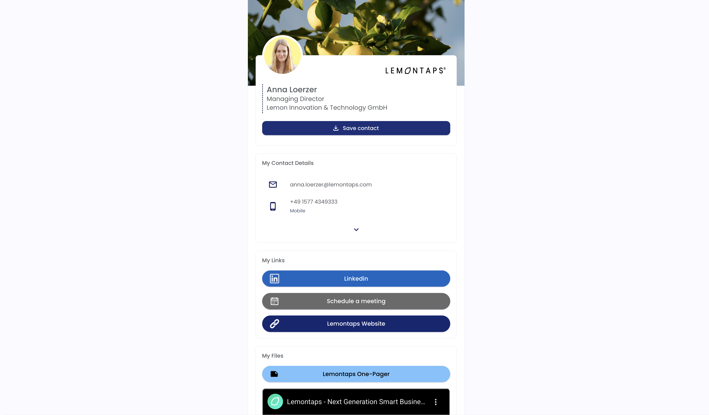 Let your team show off who they are while showcasing the products, services, and company marketing materials (images, videos, and pdfs) all in one simple web page that drives customers and prospects to take action. Exchange contact information or send people to relevant sites or content from one page. Then, follow up right from our mobile or desktop application or send contacts straight to your CRM.