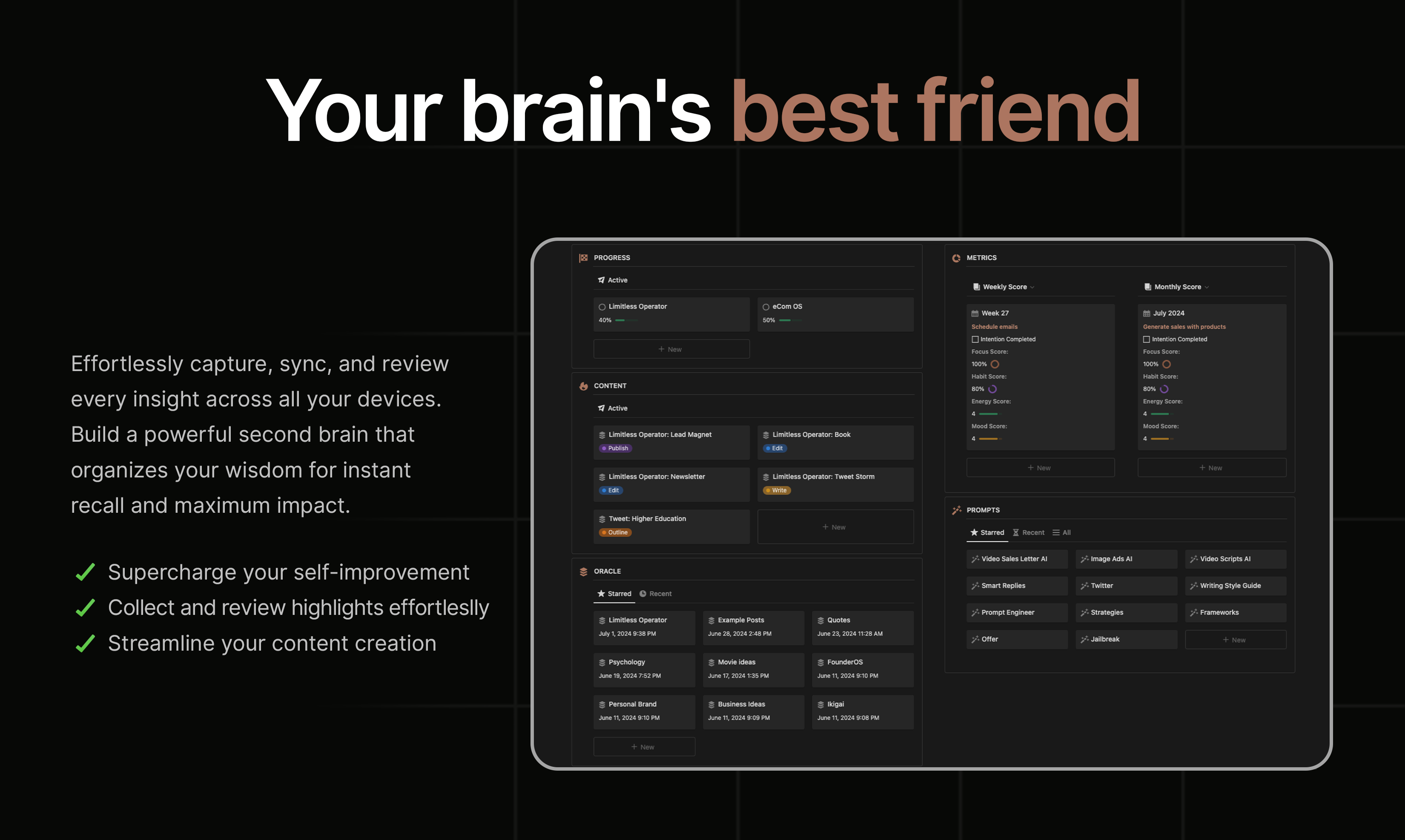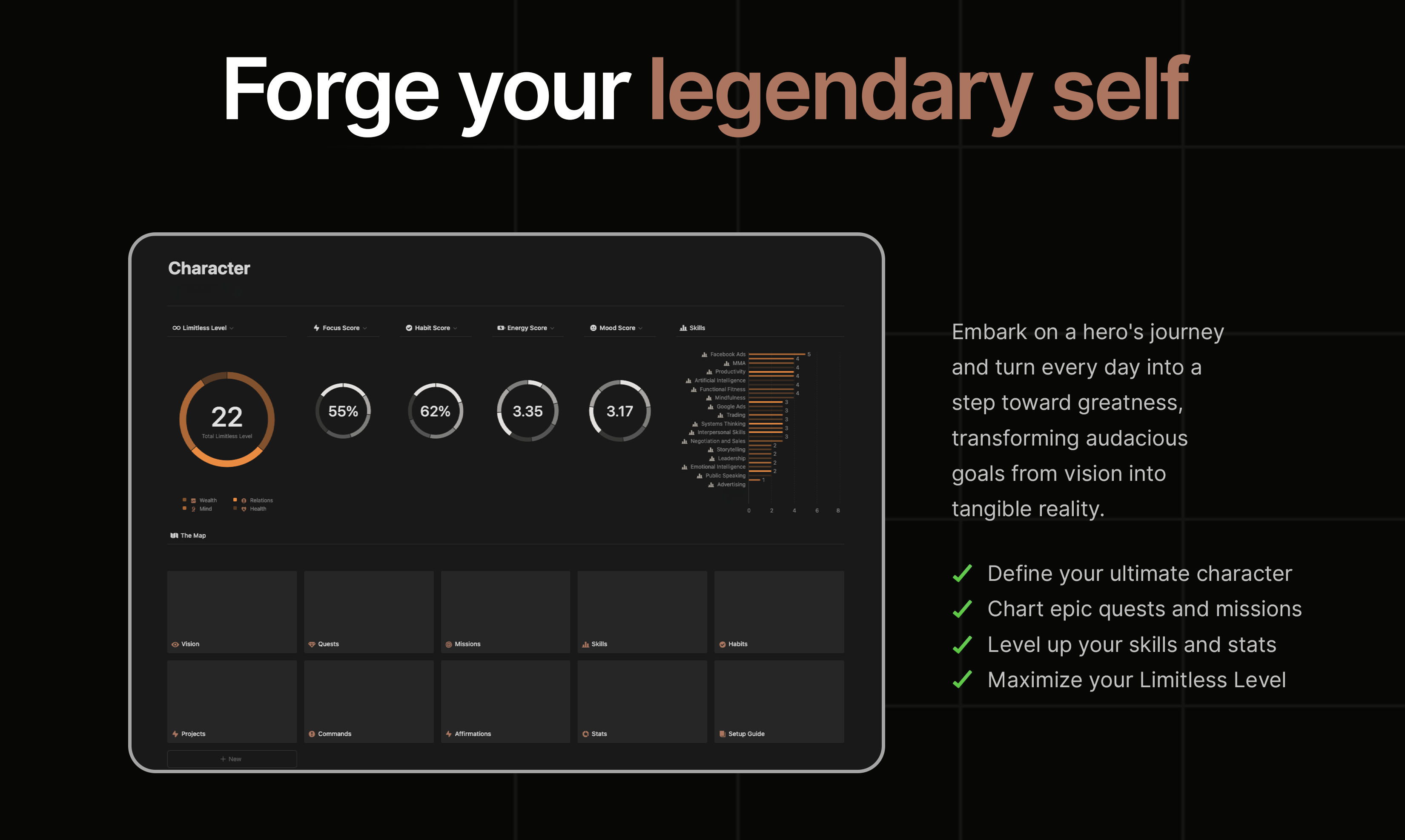 Dominate the game of life with an optimized second brain. Watch your vision manifest into reality as you become truly limitless.