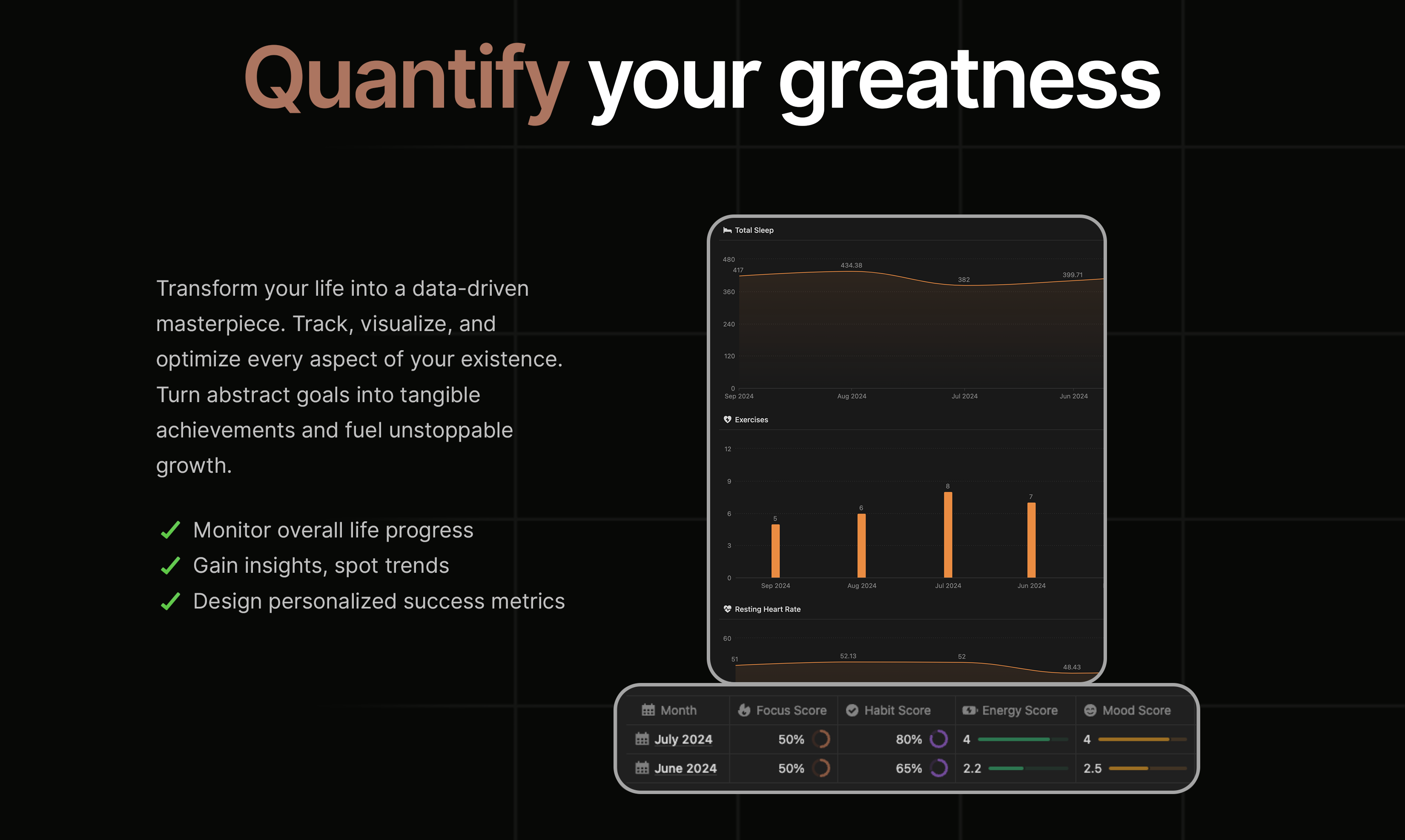 Transform your life into a data-driven masterpiece. Track, visualize, and optimize every aspect of your existence. Turn abstract goals into tangible achievements and fuel unstoppable growth.
