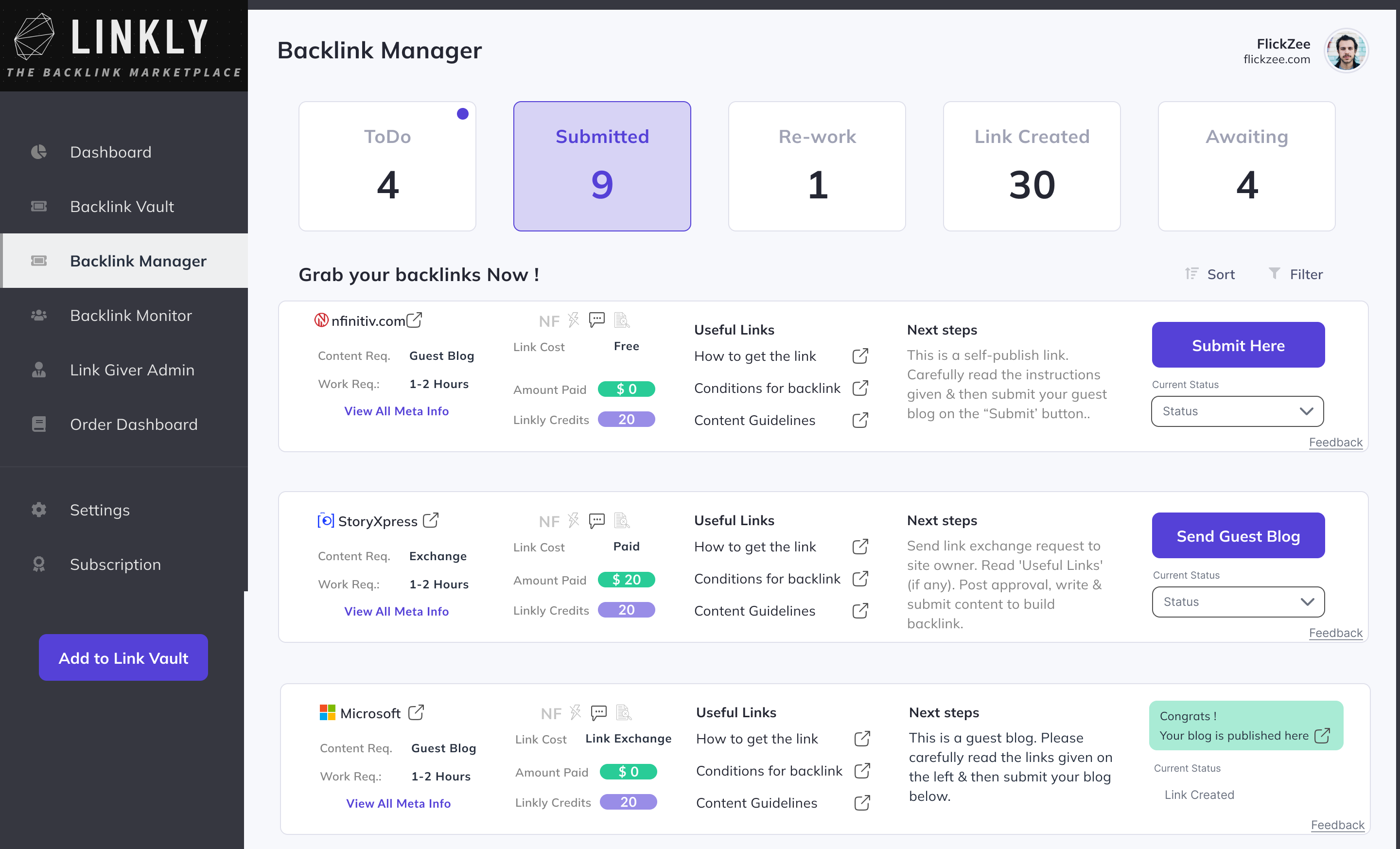 The choice of services available; guest blogs, non reciprocal link exchange & paid backlinks. Also super easy to use. Whatever your goal is, they have a number of plans to choose from - whether you're just getting started or have to clock those month end targets. The customer support team too, is simply awesome; one discovery call & you'll be clear in your mind whether or not to pay Review collected by and hosted on G2.com.