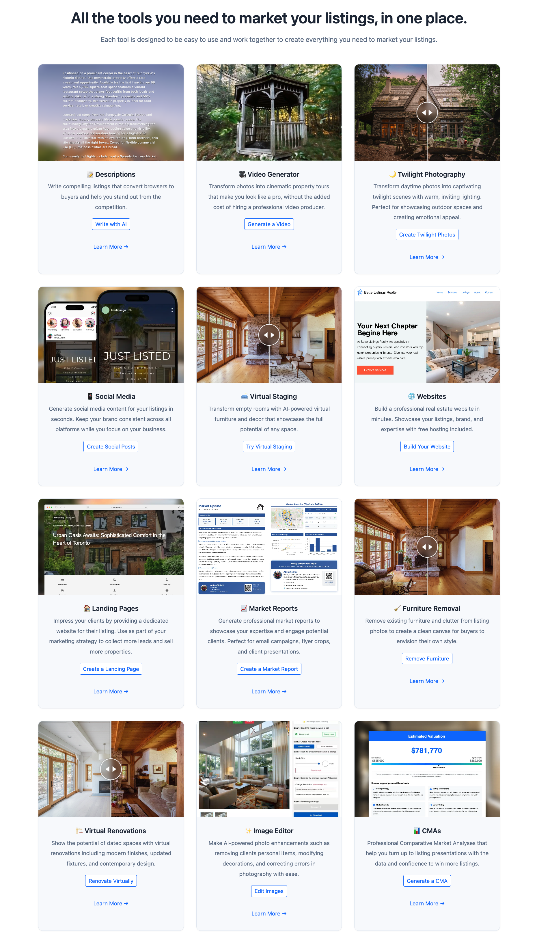 AI listing descriptions, virtual staging and renovation, professional video creation, CMA reports, lead generation tools, SEO-optimized realtor websites with MLS integration, and social media content management. Designed for ease of use—even non-tech-savvy agents can create professional marketing materials quickly.