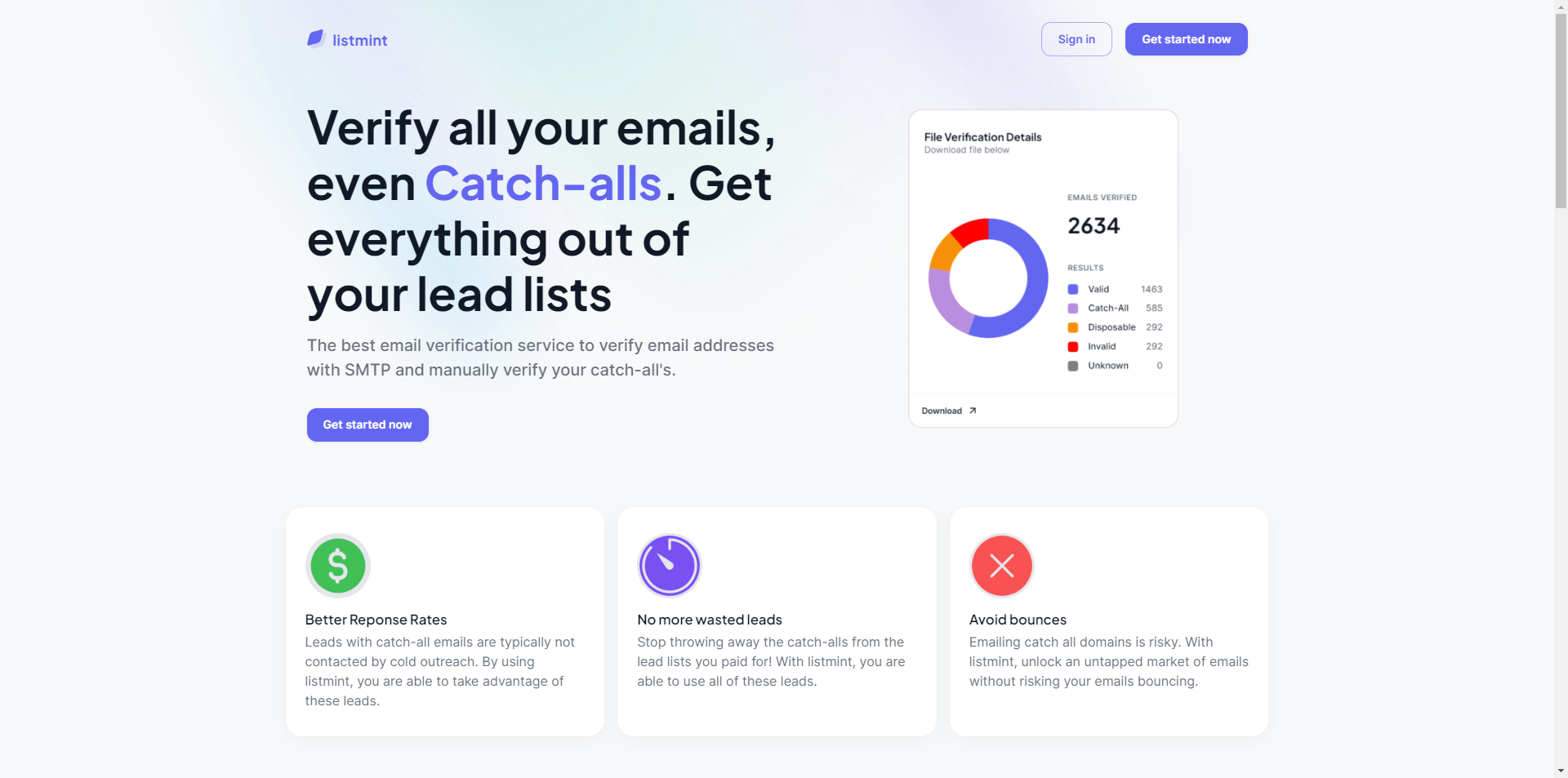 Listmint does both standard smtp validation where they tell you if the email is valid, catch all, unknown, or invalid. But list mint also takes it a step further and verifies the catchalls for you as well. But what makes this better than Bounceban or Findymail for catchall verification is that Listmint actually tells you in the final result if the email was valid or if it was a catchall deliverable. Those other tools won't tell you if it was a standard smtp valid, they'll just say the email is deliverable. This is important because standard smtp valids are not the same thing as deliverable catchall valids - one can get you a higher bounce rate than the other.