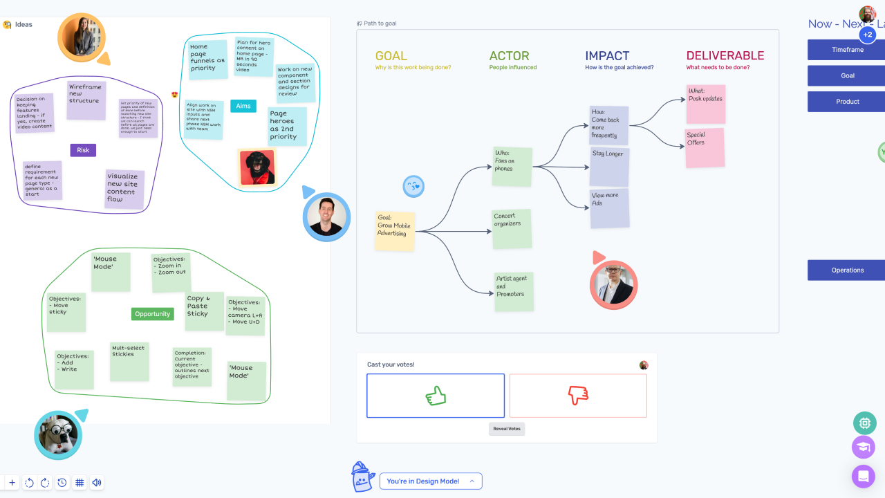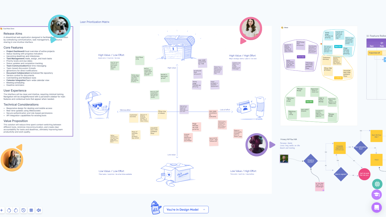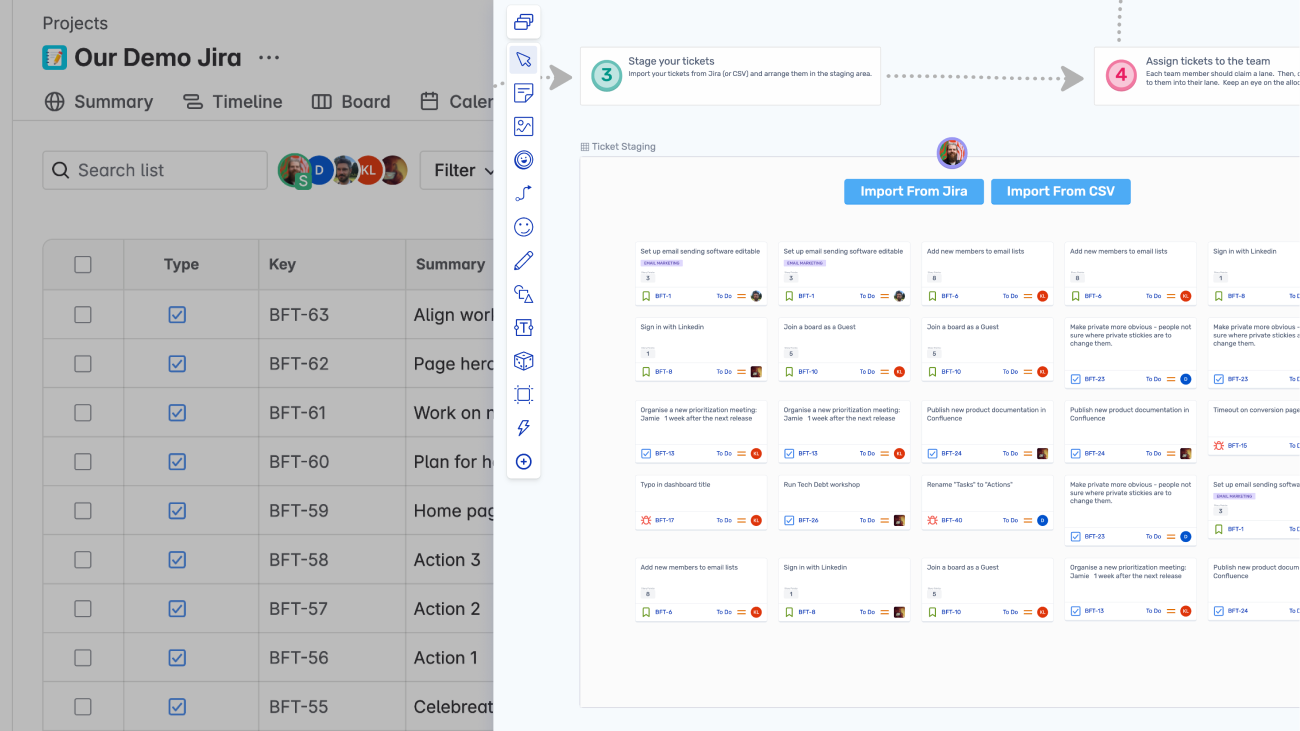 Teams can pull Jira backlog items onto the board, estimate collaboratively using Fibonacci or T-shirt sizing, drag Jira cards around the canvas, create new Jira issues from sticky notes, and sync updates back to Jira automatically. This supports sprint planning and backlog refinement workflows without manual data entry between tools.