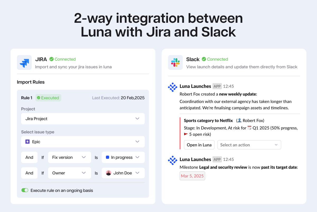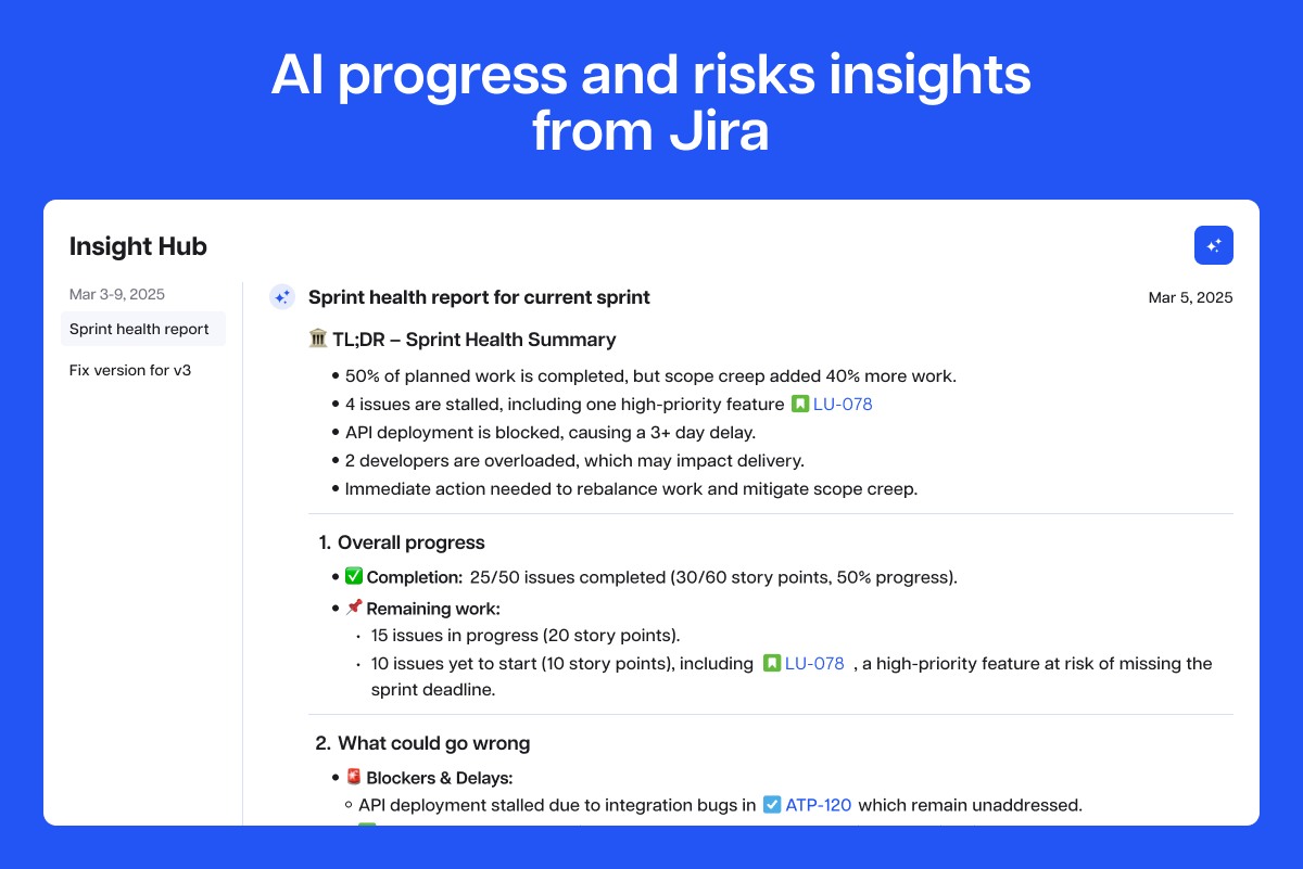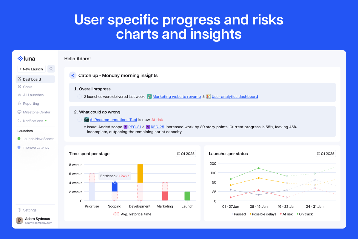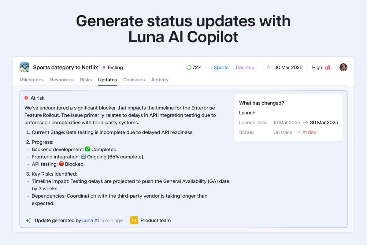 One of my favorite features is how Luna proactively identifies potential blockers and dependencies that could impact our goals. This has helped us stay ahead of risks and make informed decisions early.
