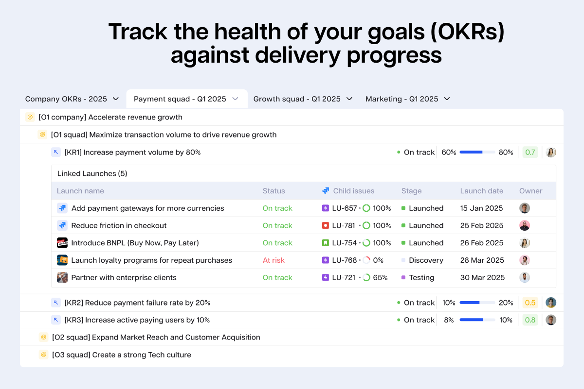 I started using Luna because my team needed a real-time solution to track the health of our OKRs. Luna has perfectly answered this need. It links key results to the underlying initiatives, making it incredibly easy to assess whether we're on track.