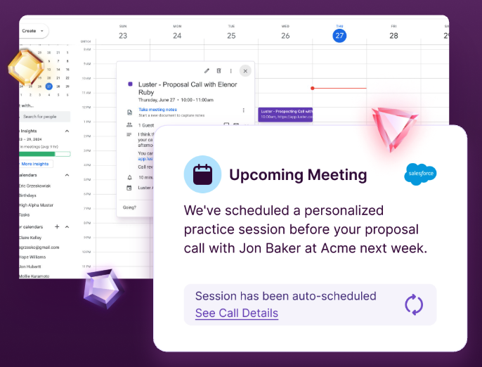 Luster will scan your calendar, identify calls that are scheduled where you're about to make a revenue impacting mistake due to a lack of proficiency, and custom create and schedule a practice session automatically.