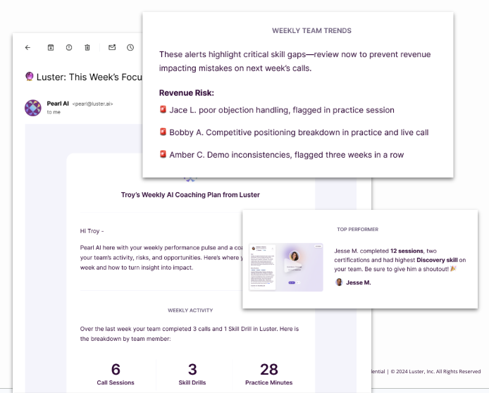 With Luster reps can practice new skills, talk tracks and objection responses in a low stakes, hyper realistic environment. It allows them to get more "at bats" and get real time feedback from the AI. Reps gained confidence and appreciated the realistic nature of the scenarios. Our sales leaders also love Luster because it allows them to quickly assess the skills of their team and be targeted in their coaching without a huge burden on them to listen to a ton of live or recorded calls.