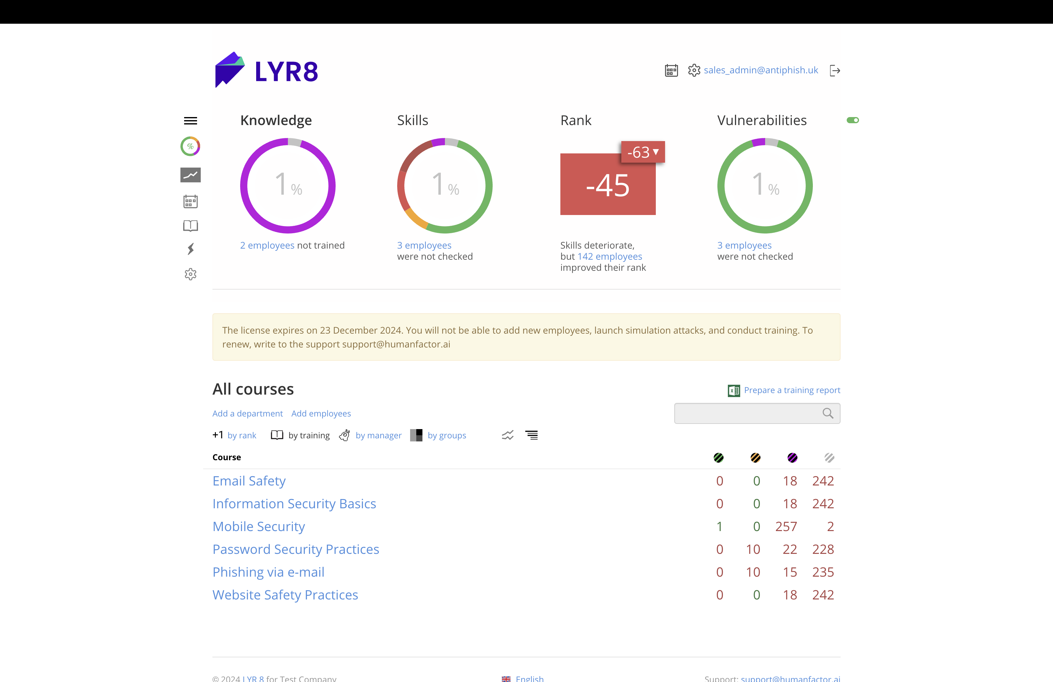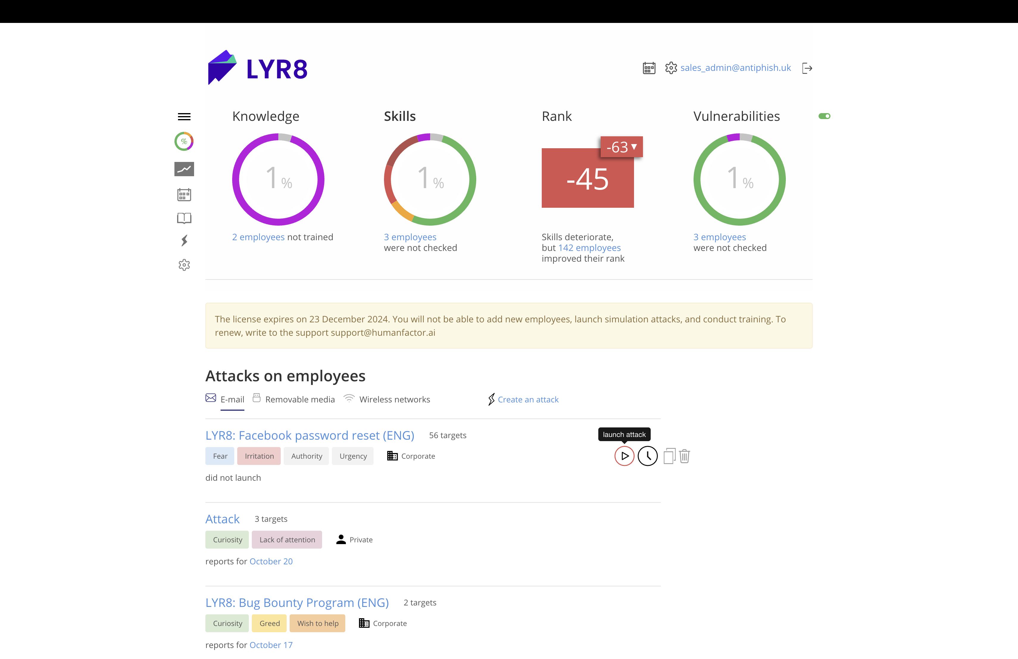 LYR8 is a security awareness platform that empowers organisations with essential cybersecurity skills through courses, online simulators, and simulated attacks via email, websites, fake WiFi access points, and USB-HID devices. LYR8 enables centralized management of employee training and testing, offering the ability to customize attack scenarios and access detailed reports.