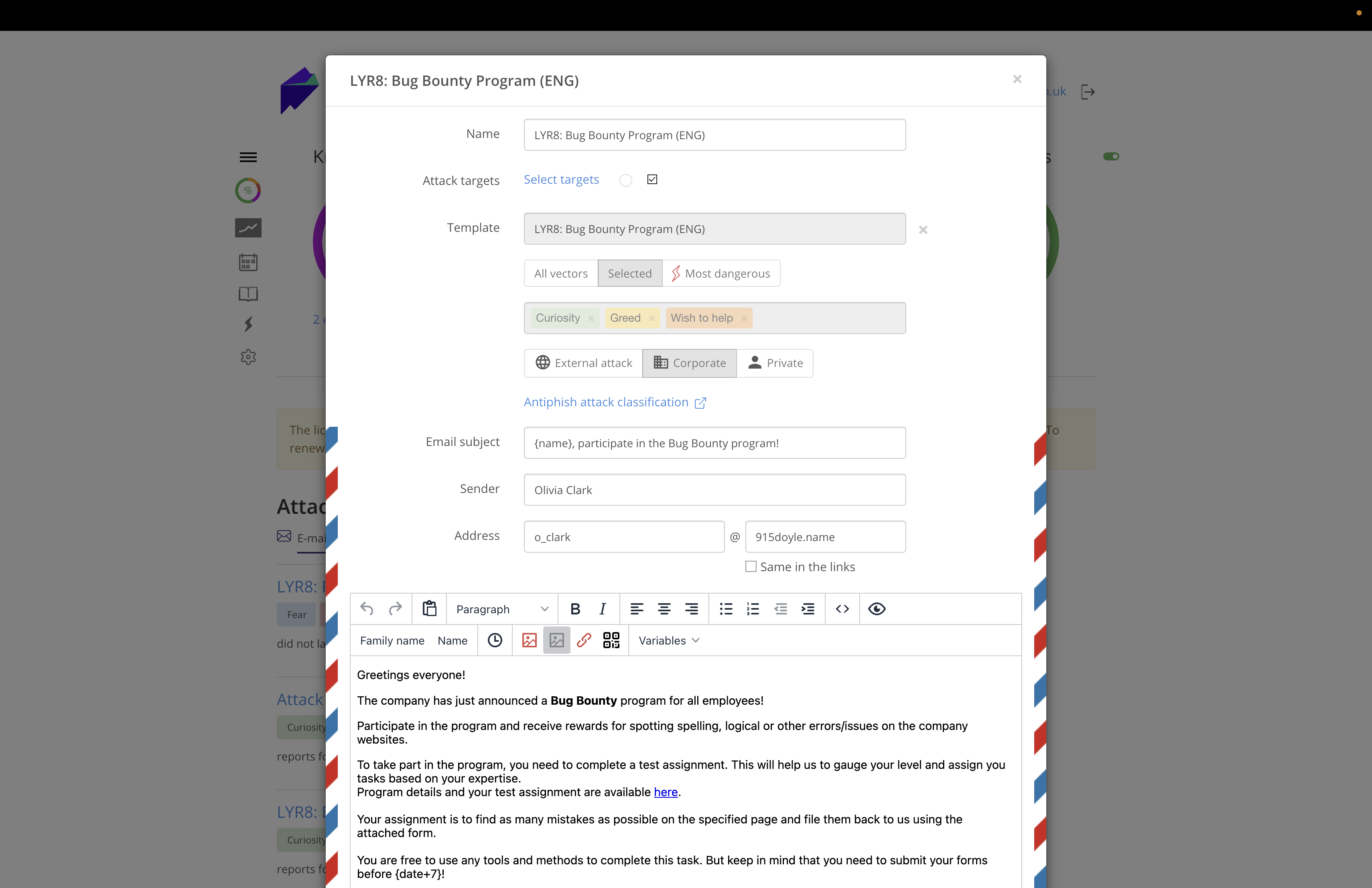 LYR8 offers clients a wide range of simulated email attacks, directing users to simulated phishing sites and including attachments (Word, Excel, PPTX, etc.), links, and QR codes. Attachments can also be packaged into ZIP and ISO files, allowing partners to replicate various attack scenarios.