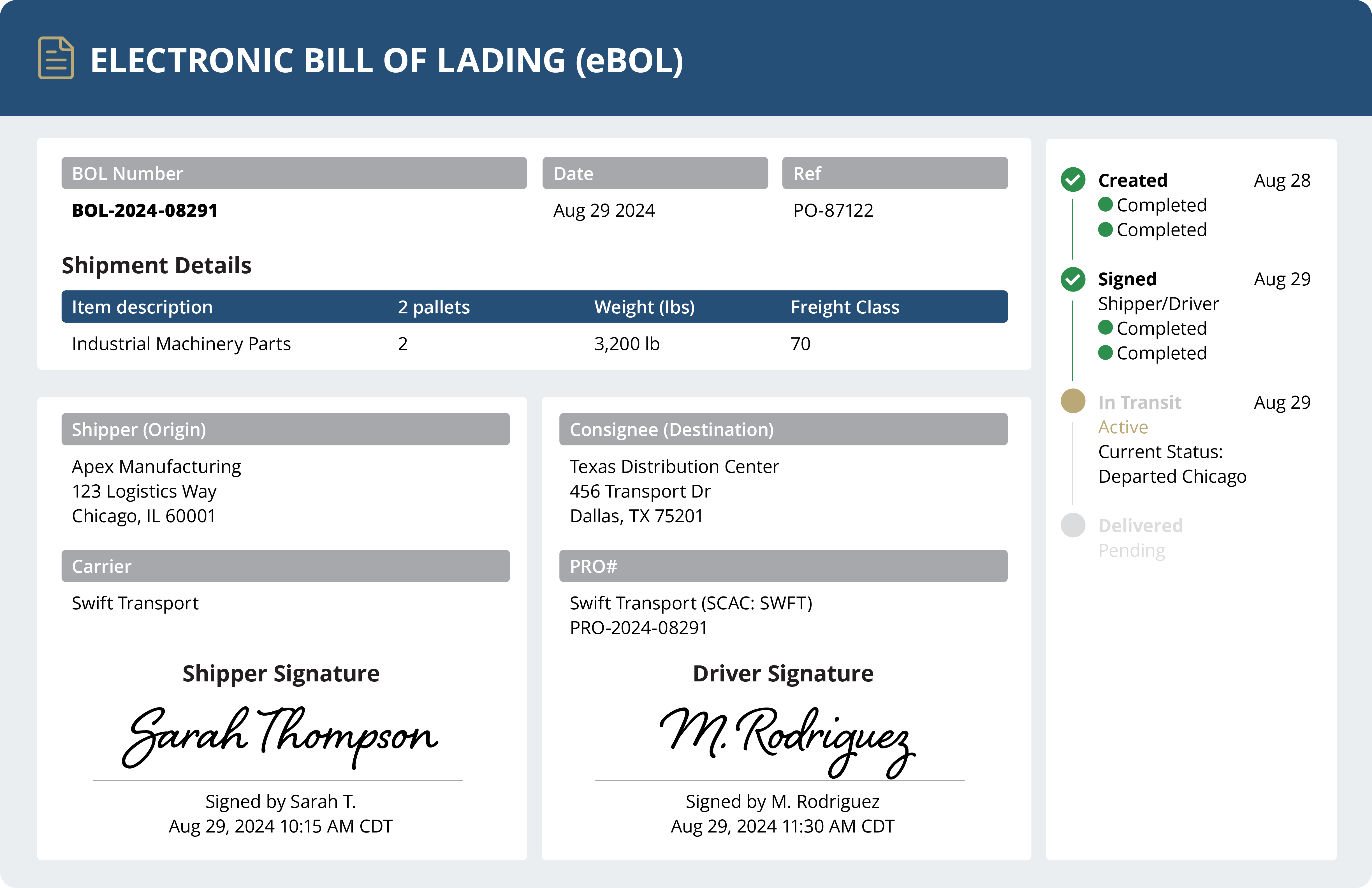 The eBOL module is a digital bill of lading solution that replaces paper BOLs with electronic documents that are created, signed, and stored digitally. Drivers sign on a kiosk or mobile device, and for LTL loads with multiple BOLs, a single signature can be applied across all documents on that load. Every digital BOL is stored with a complete audit trail for compliance and audit readiness. The shift from paper to electronic bill of lading processing reduces detention fees, eliminates document errors, and gives your team hours back every week.