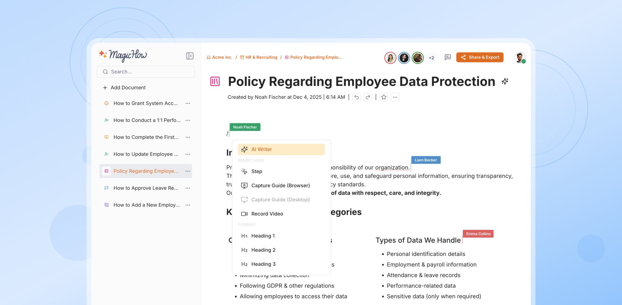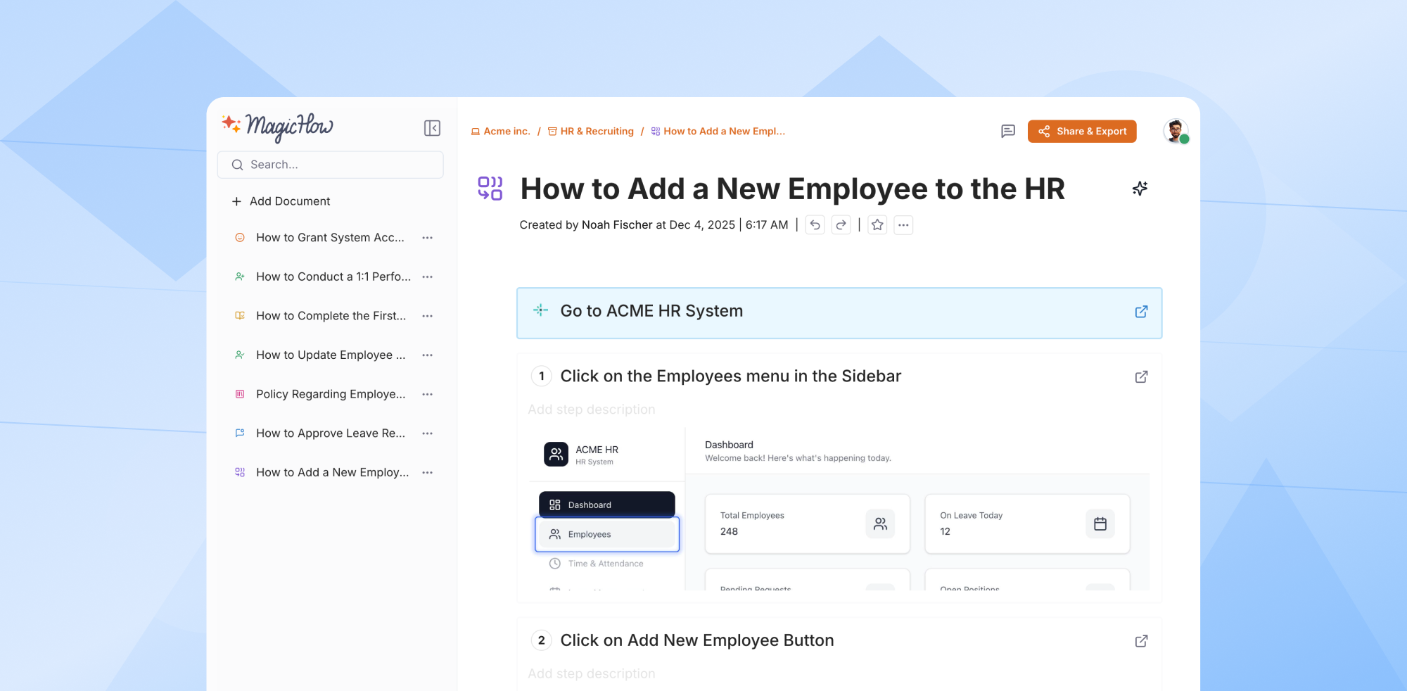 Incredible how easy it is to just follow your regular workflow in the software, click buttons fill in fields and the tool records this for you and turns it into SOPs. I wish I found it earlier as I used to just screenshot everything and type instructions manually. We are launching an LLM visibility SaaS and I'm planning to work on the knowledge base for it with MagicHow - super intuitive and saves tons of time for our team Review collected by and hosted on G2.com.