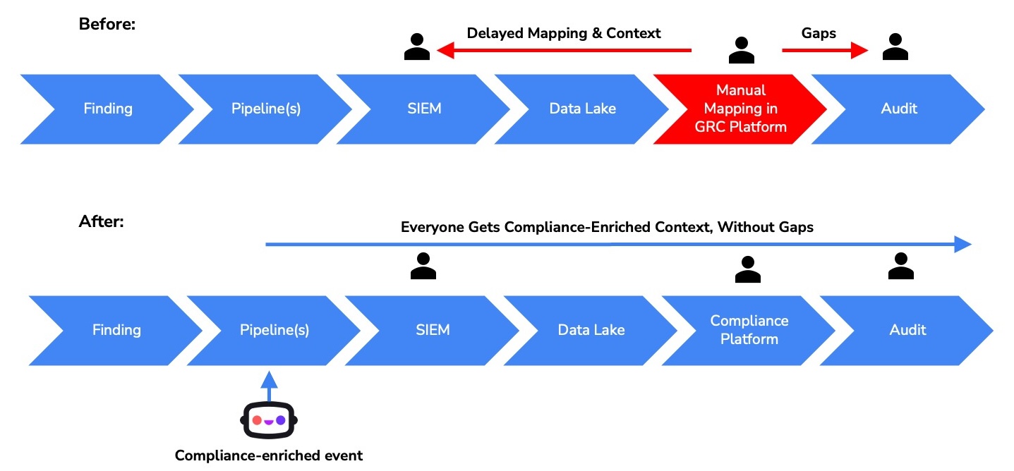 Mapping API operates as a standalone service and does not require deployment of a full governance, risk, and compliance (GRC) platform. It is commonly used to enrich data in motion within systems such as SIEM, security data lakes, observability pipelines, or ticketing workflows.