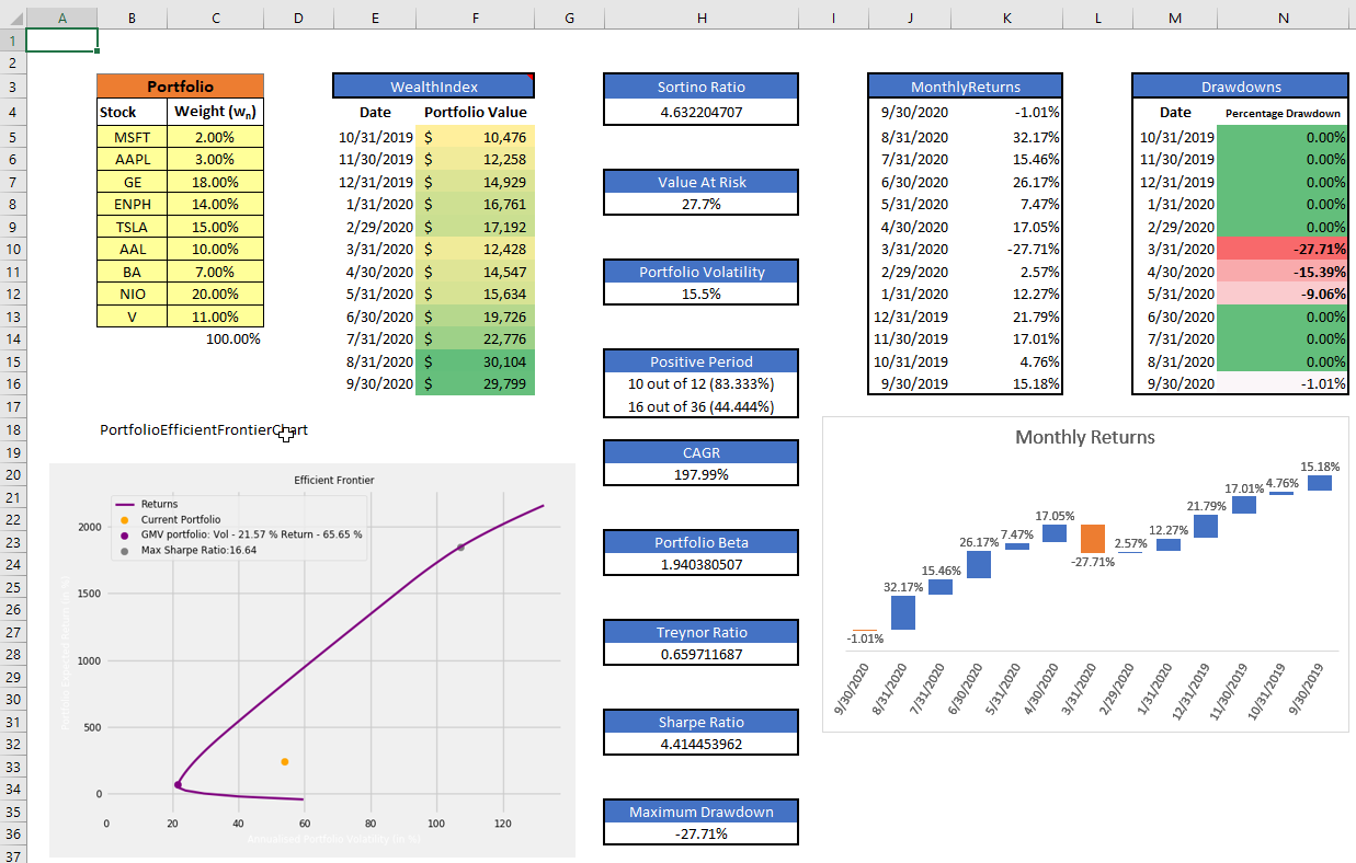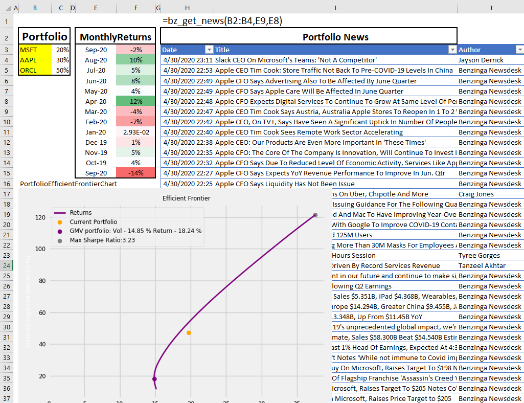 Portfolio Optimization: MarketXLS has impressive portfolio tools that enable users to monitor everything from performance stats, taxes, allocations, returns, risk profiles and optimized portfolio allocations.