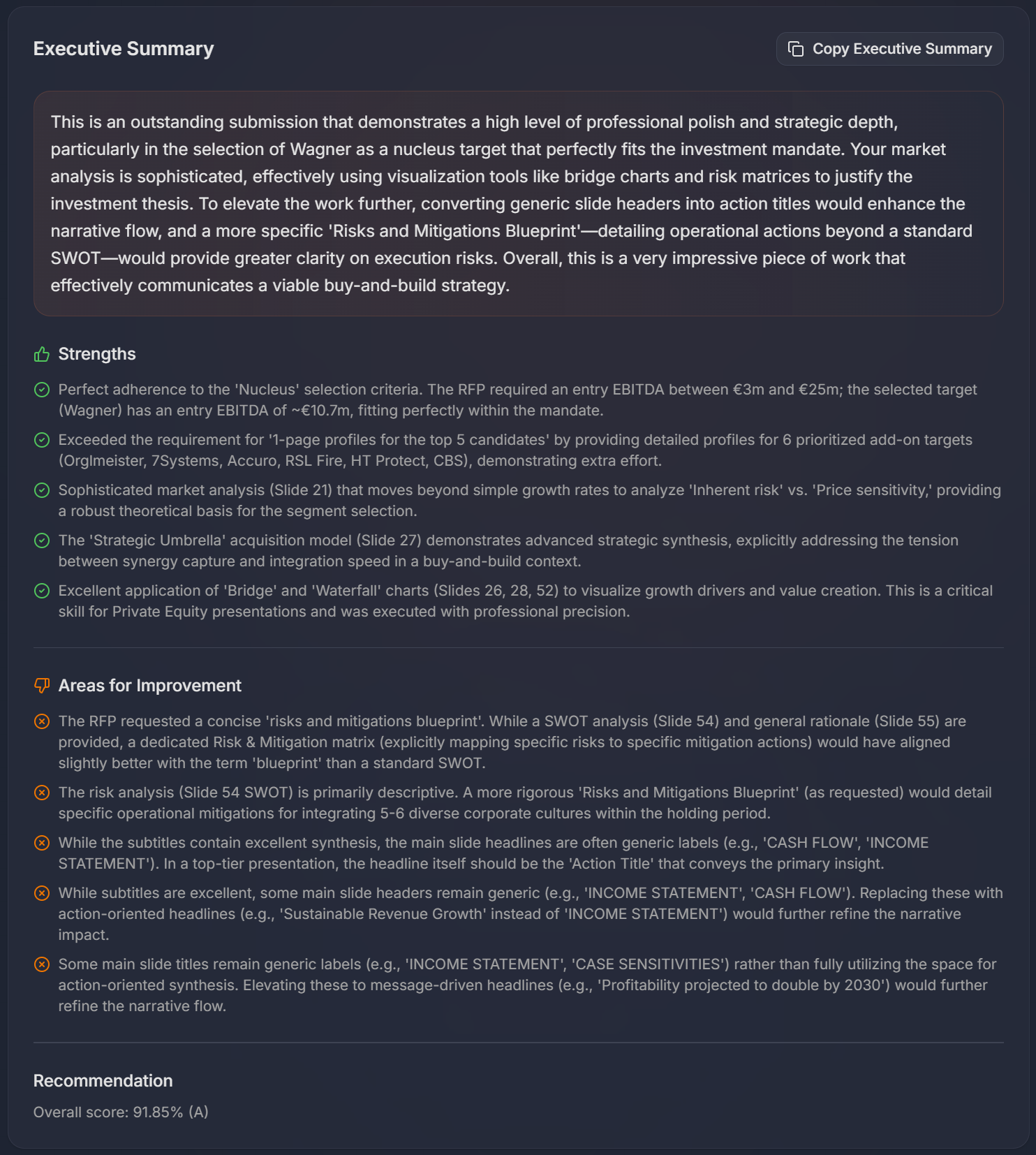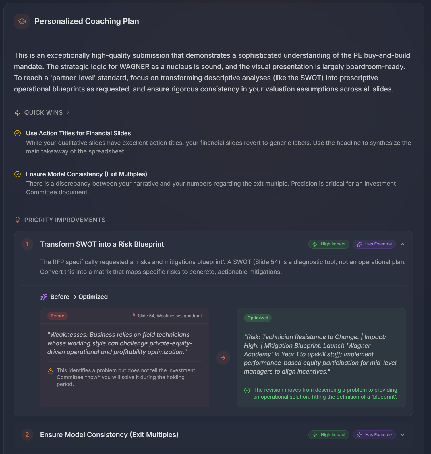 Beyond scoring, MarkInMinutes generates personalized improvement coaching for each student. Rather than vague comments like "needs more analysis," students receive specific guidance on individual errors and concrete steps for growth. This transforms feedback from a grade justification into a genuine learning opportunity.