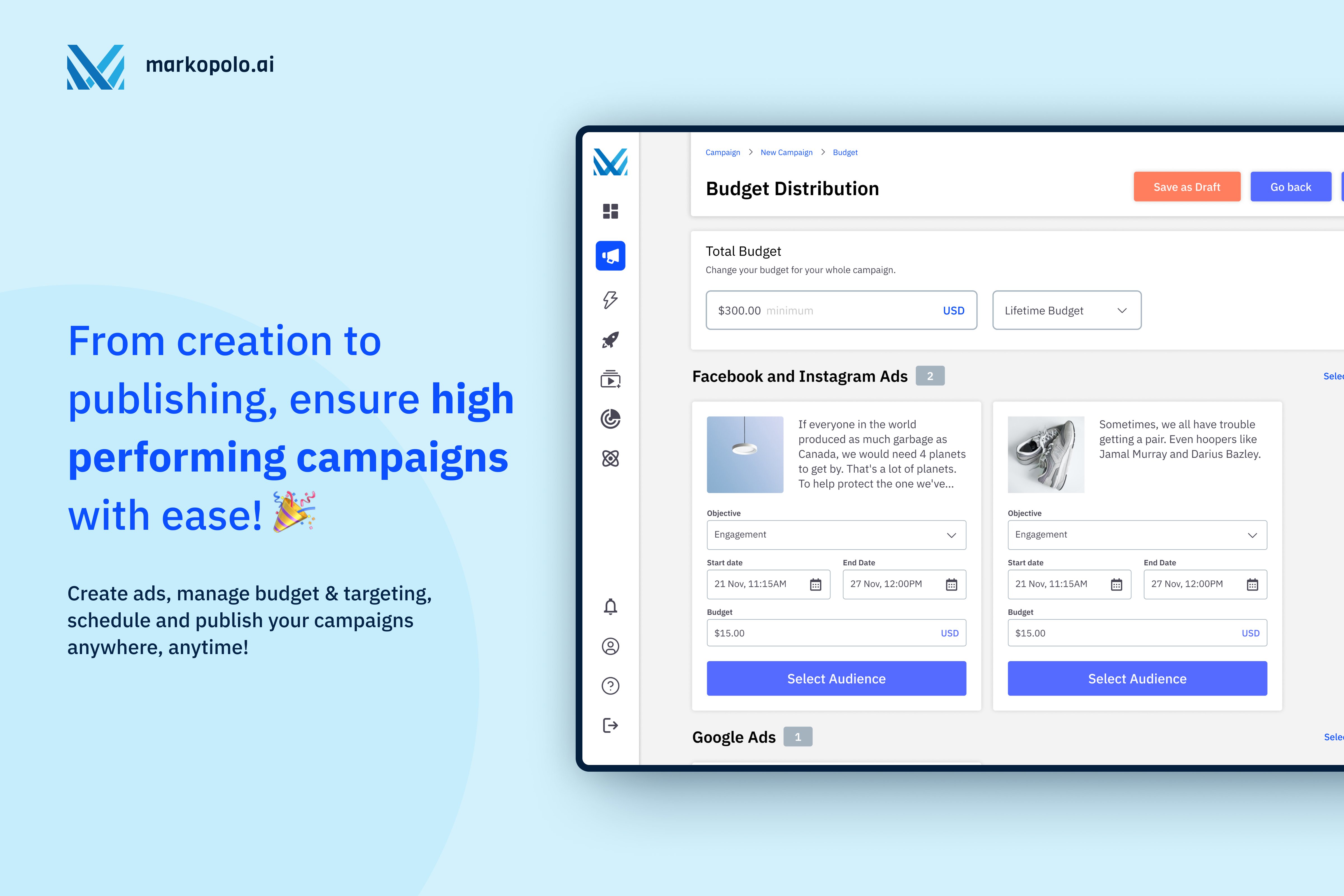 - Automated Scheduling and Budget Allocation: Facilitates the launch and scheduling of multiple posts across platforms, with features for setting campaign duration, target locations, and objectives, as well as allocating budgets and conducting A/B tests.