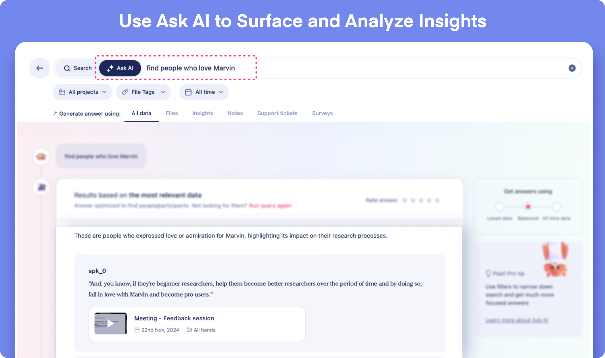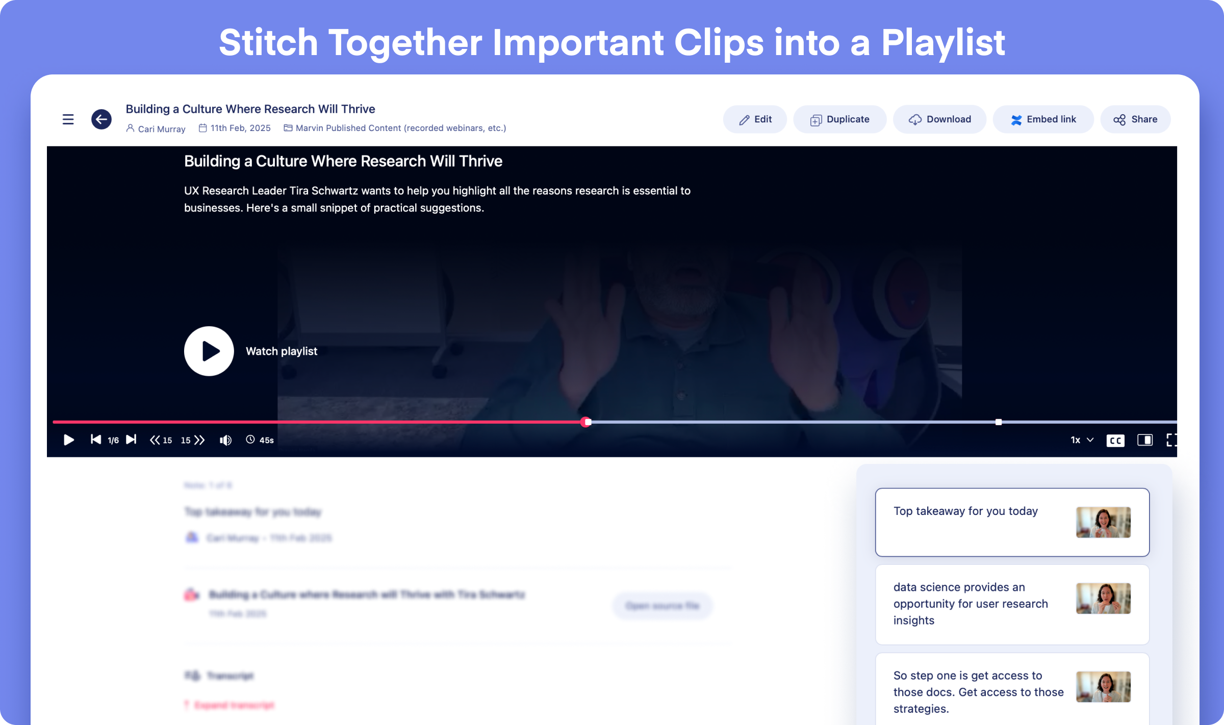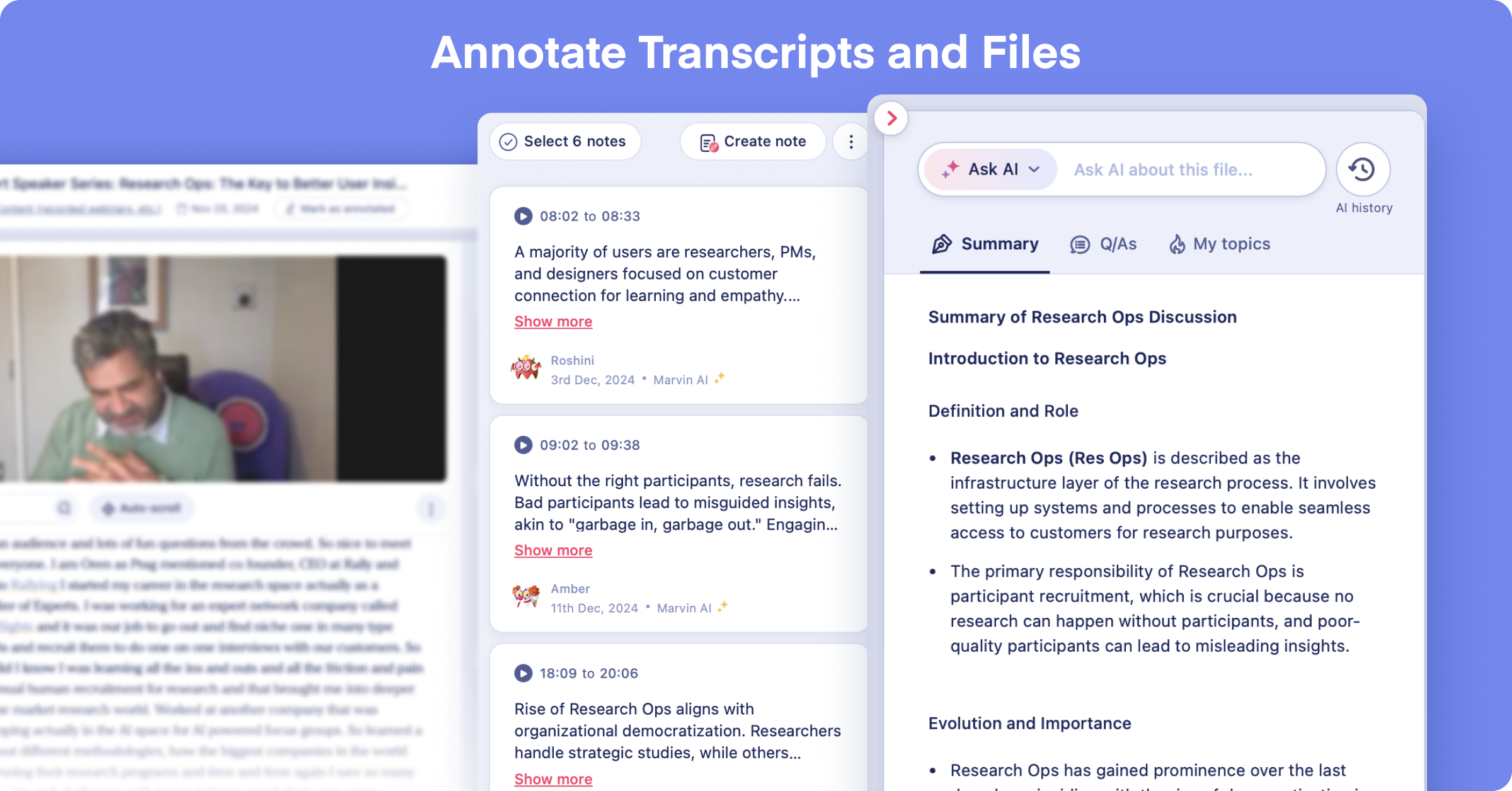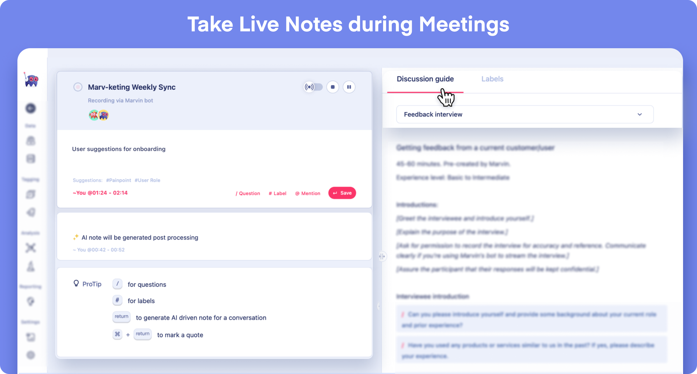 - Marvin’s AI notetaking for live interviews and recordings automates a time-consuming task and frees up time for deeper analysis.
