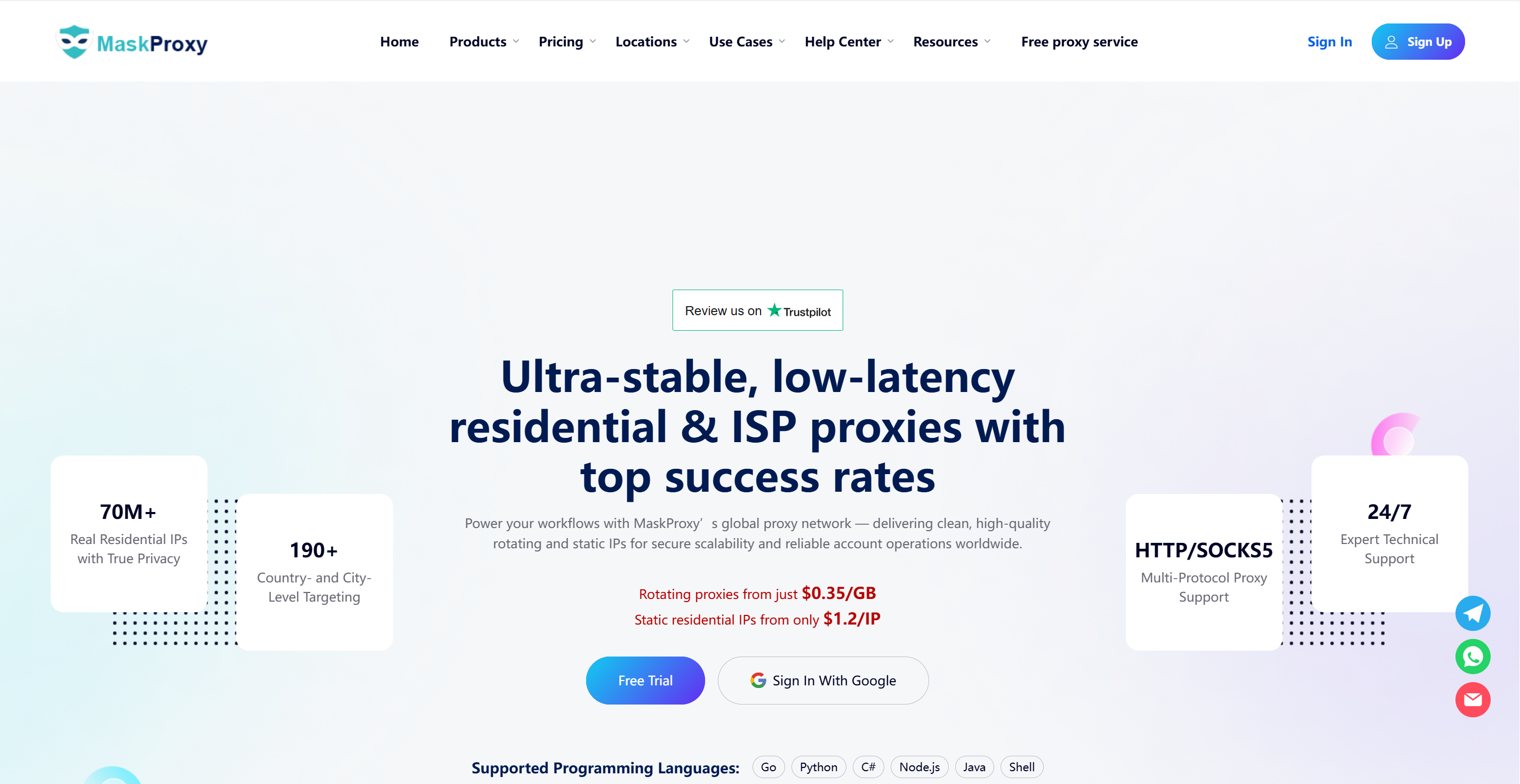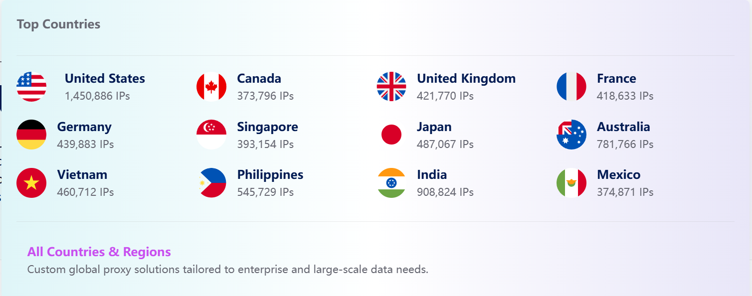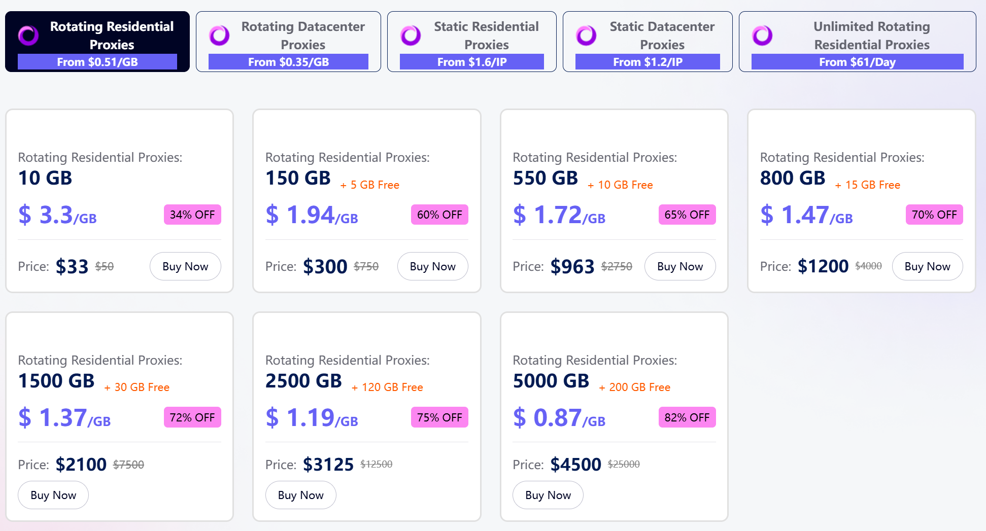 Proxy.cc is a reliable proxy provider offering 5 main types (residential, unlimited, static, etc.) with 90M+ IPs across 190+ regions, 99.5% success rate, GDPR compliance, for market research, web scraping and SEO monitoring.