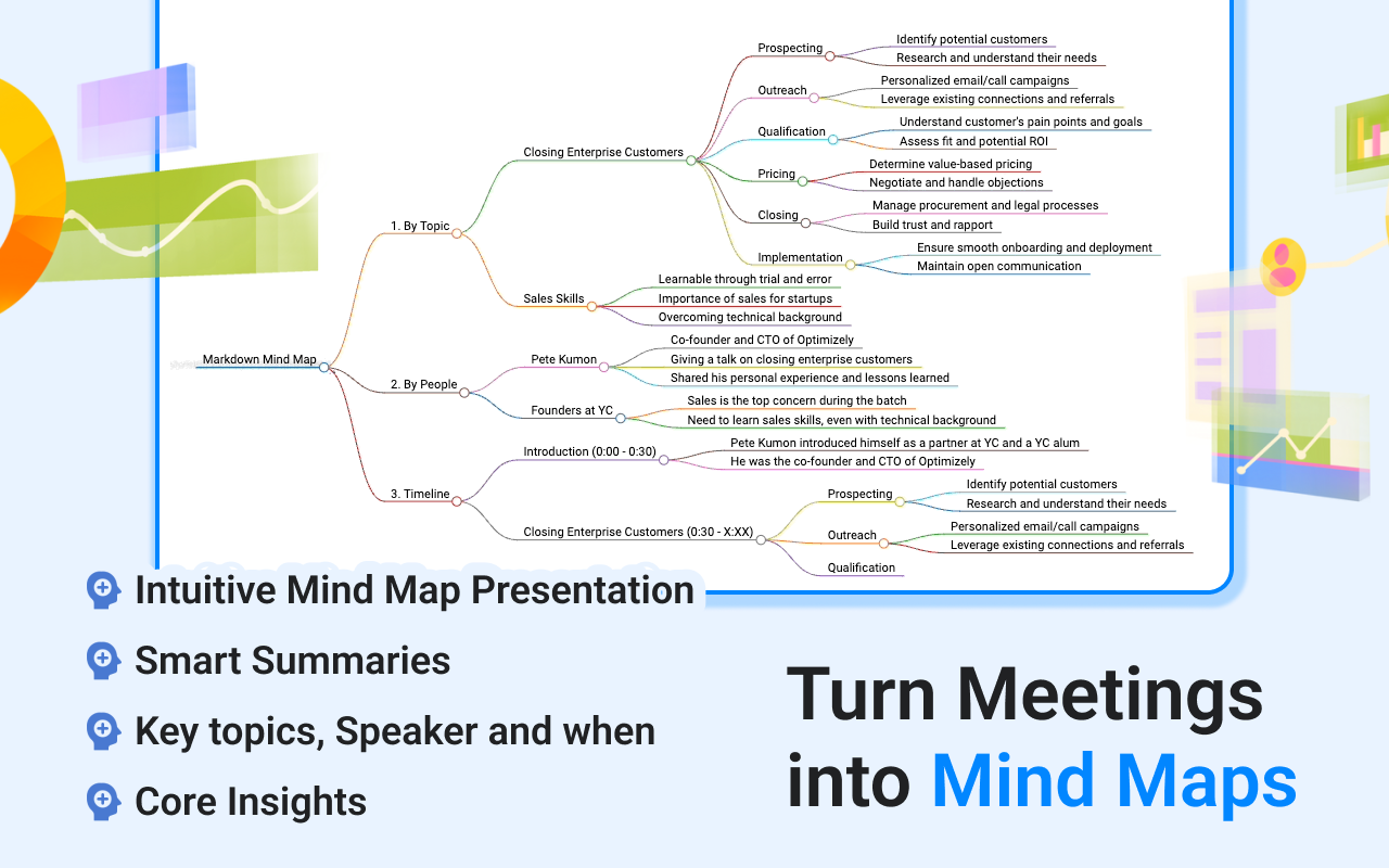 1.Automated mind map creation: The AI analyzes meetings and creates summaries based on key topics, speakers, and important points, organizing the information visually.